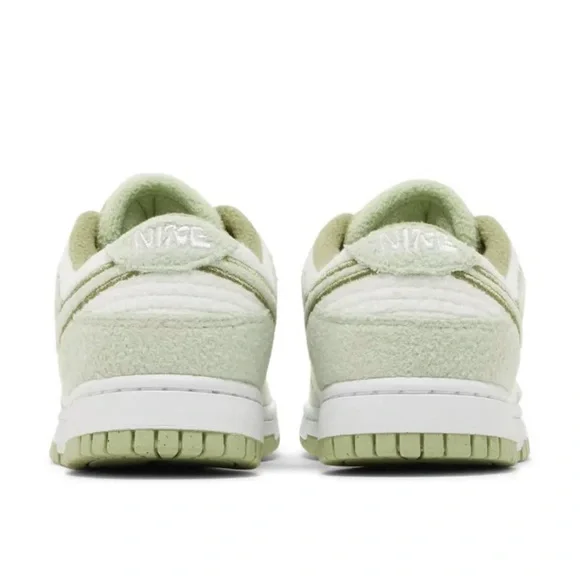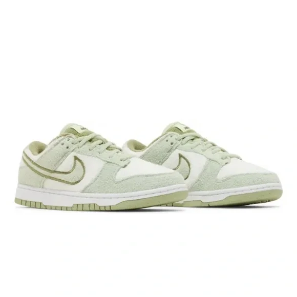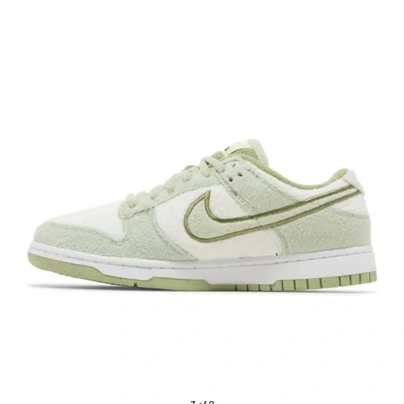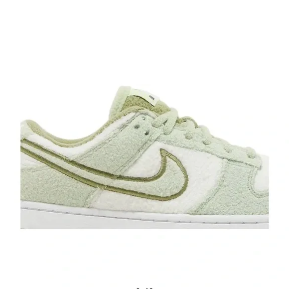 The Nike Women’s Dunk Low SE ‘Honeydew’ transforms the hardwood classic with a refreshed build, featuring a fuzzy fleece fabrication in lieu of traditional leather materials. The plush textile combines a white base with Honeydew green overlays and a color-matched Swoosh outlined in tonal embroidery. Updated Nike branding decorates the tongue tag, heel tab, and sockliner. The shoe’s rubber cupsole is unchanged from the original, highlighted by white sidewalls and a lime green outsole.- Worn once - Great condition