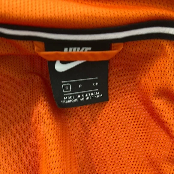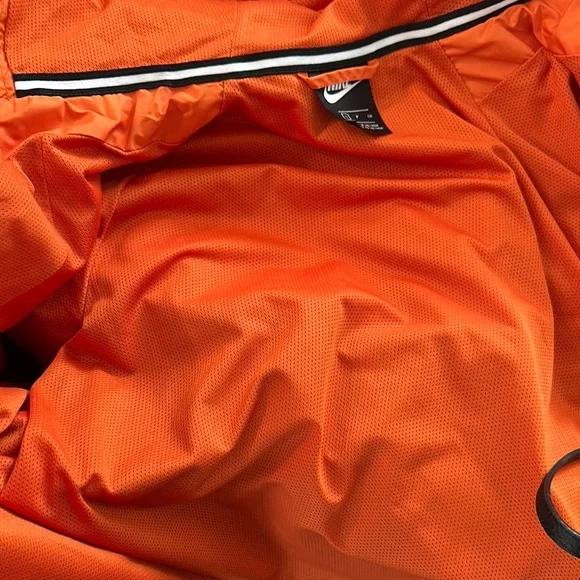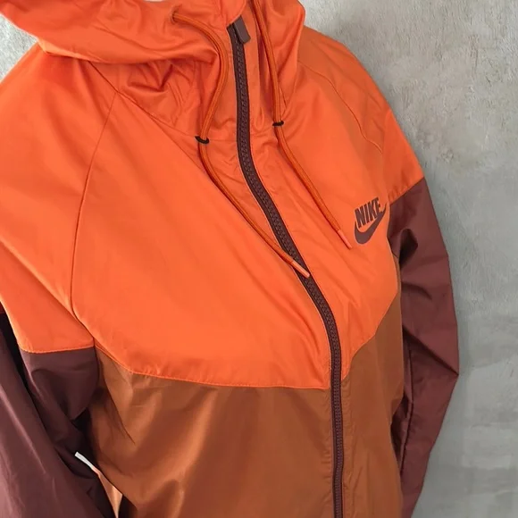 Experience the perfect blend of style and functionality with this Nike windbreaker, featuring a striking orange and brown color block design. Crafted for lightweight comfort, it includes a full-length zipper and an integrated hood, making it ideal for athletic or casual wear. In perfect mint condition.