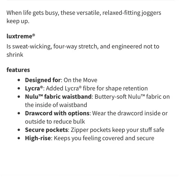 Like new condition size 14 high rise joggers. No stains, holes, flaws, or signs of wear. Riptag and size dot intact. 28” inseam.