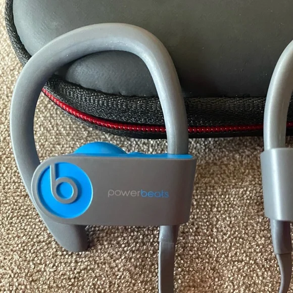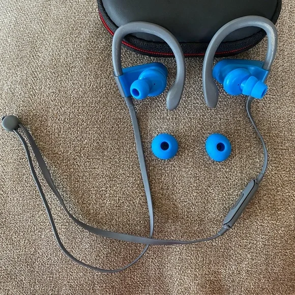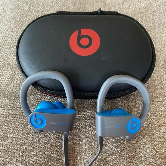 Powerbeats3 Wireless Bluetooth Headphones - Blue and Gray / Sweat-proof, Secure FitThese Powerbeats3 wireless earphones offer high-quality sound with a secure, comfortable fit designed for active lifestyles. The earphones feature adjustable ear hooks for stability during workouts, and removable silicone ear tips for a personalized fit.Key Features:-Wireless Connectivity – Enjoy tangle-free listening with Bluetooth technology-Sweat & Water-Resistant – Built for intense workouts and outdoor activities-Secure-Fit Ear Hooks – Stay in place for comfort and stability-Great Sound Quality – Powerful audio with deep bass-Long Battery Life – Extended playtime for workouts and daily use-In-Line Controls – Adjust volume, skip tracks, and take calls with easeIncludes:1. Powerbeats3 wireless headphones (Blue/Gray)2. Two pairs of silicone ear tips3. Beats carrying case4. Connecting cableCondition: Used, in good working condition