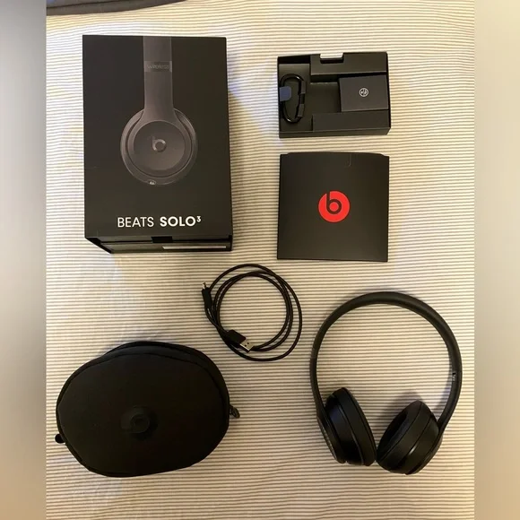 Beats by Dre Solo3 Wireless headphonesOriginal packaging and all original contents of box includedNo damage or issues or flawsPerfect working condition!On-ear styleFeatures:Carrying case with carabinerCharging cordManualSelling because I don’t reach for them much anymore.Message me with questions!
