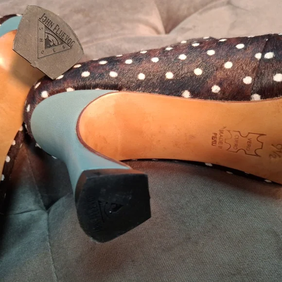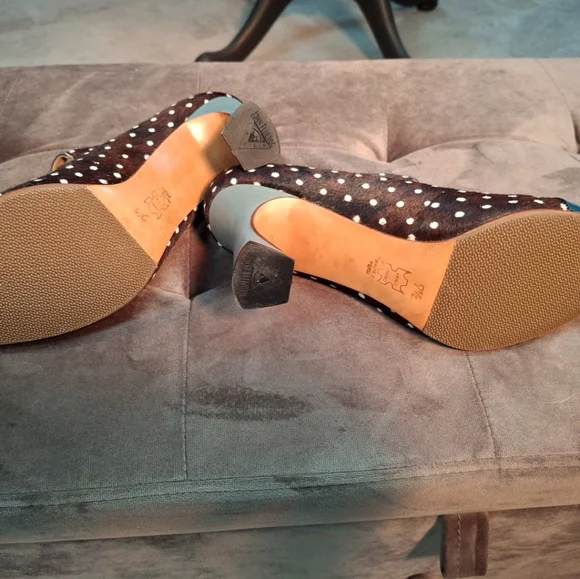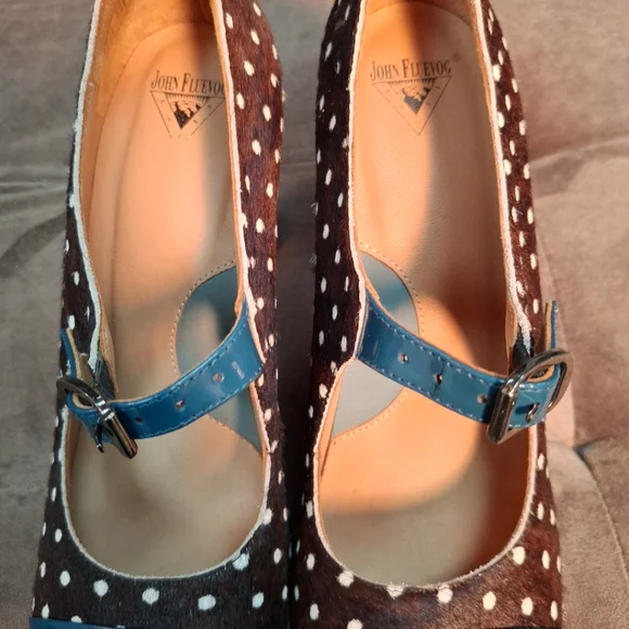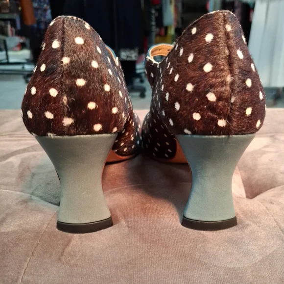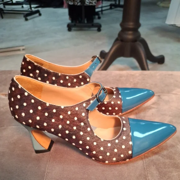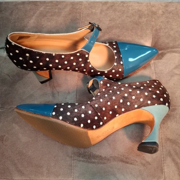 Chic Mary Jane heels with a blue patent leather toe. Brown and white polka dot pattern on the pony fur. Adjustable strap for comfort.