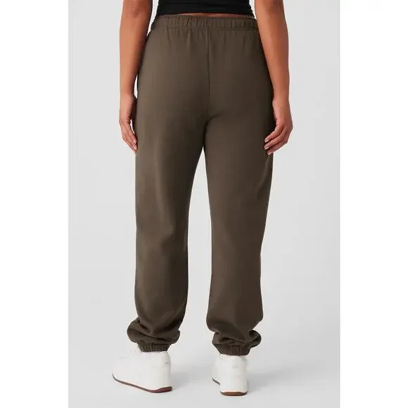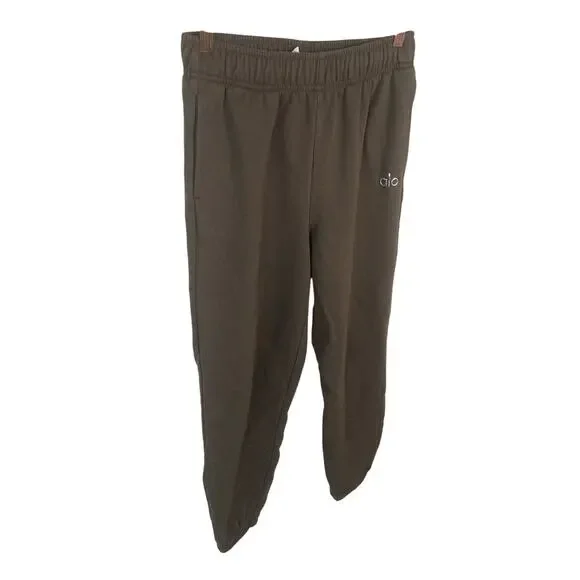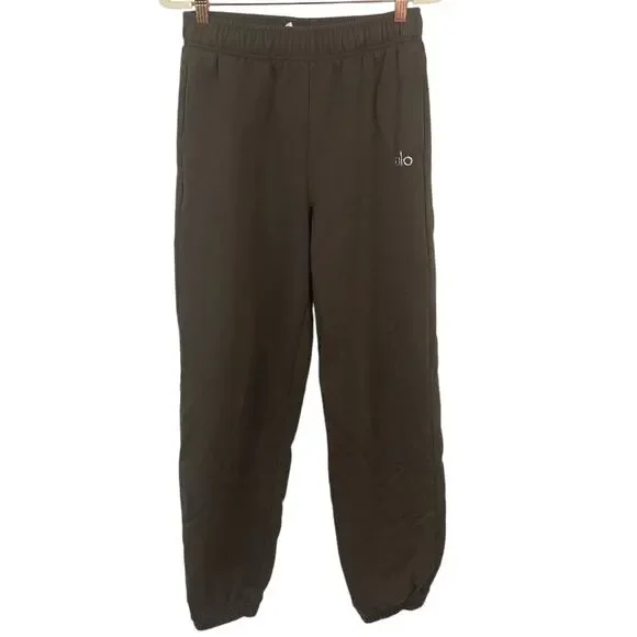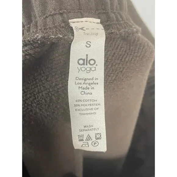 The search for the perfect lounge-to-street look is over. Our iconic sweats have classic details, like an elastic waistband and cuffs, plus a relaxed fit that reads laid-back but not slouchy (since this is a unisex style, we recommend sizing down to achieve this look). French terry that’s smooth on outside and fleecy on the insideDrawstring waistRelaxed fit65% Cotton, 35% PolyesterCondition: Good condition. Discoloration mark around knee on front side. Some wear to alo logo as shown.MSRP: $128Approximate measurements:Waist: 13"Riser: 12"Inseam: 27"Length: 39"Tags: casual, vacation, brunch, markets, concerts, festivals, dinner, lightweight, summer, spring, happy hour, comfortable, flattering, upscale, relaxed, classic, high waist, high waisted, classics, timeless, errands, shopping, travel, traveling, soft, stretchy, lounging, loungewear, luxury, designer, activewear, athleisure