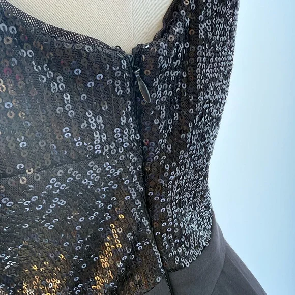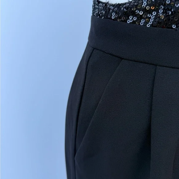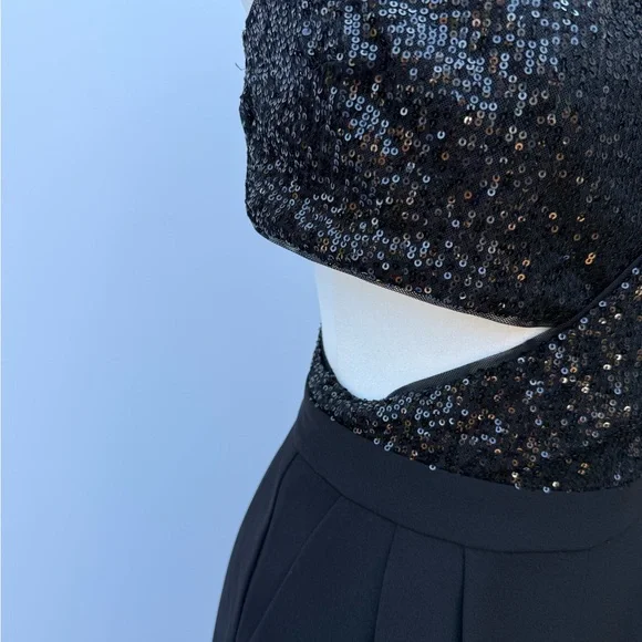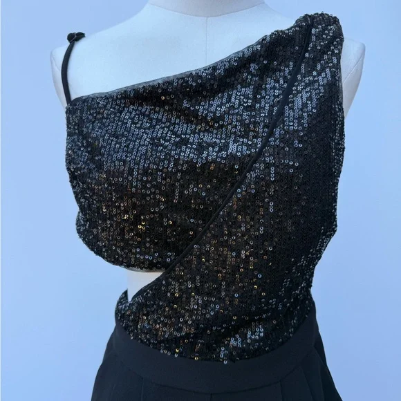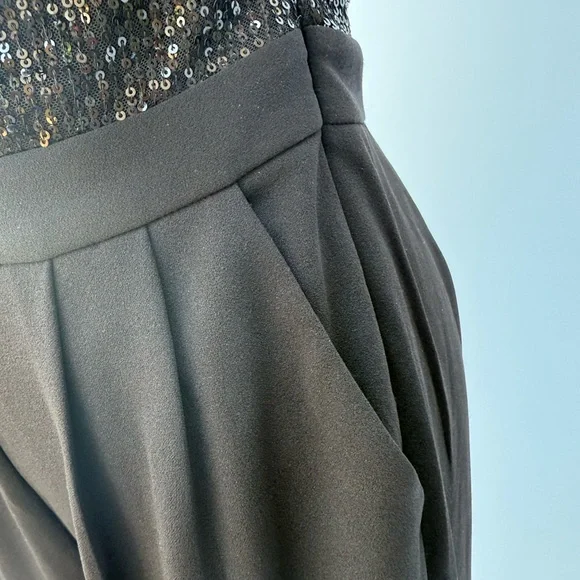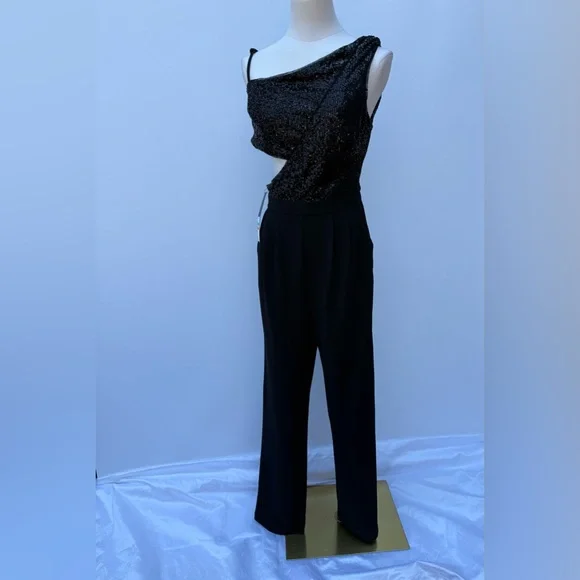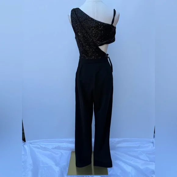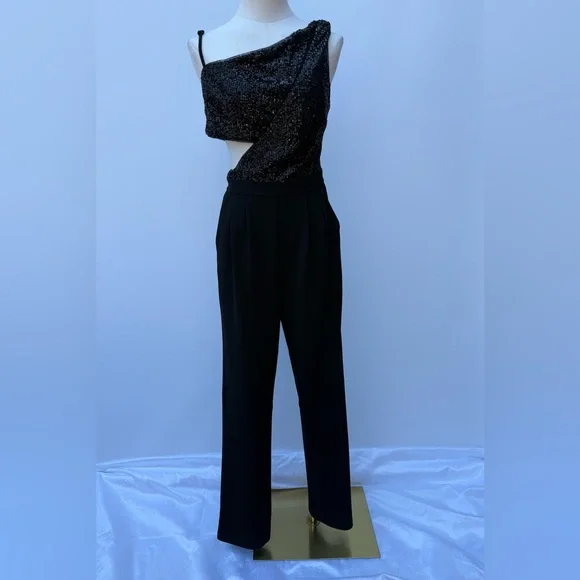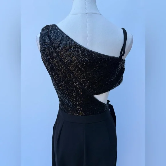 Step out in style with this elegant black sequin jumpsuit. Perfect for any occasion, it combines comfort and glamour effortlessly.Color/pattern: blackDesign details: asymmetrical bodice, adjustable shoulder strap, pleated pantLeft side seam zipper with hook-and-eye closureShell: 95% polyester, 5% spandexLining: 100% polyesterHand washImportedNew with rag Approximate measurements flat:Chest:17”Waist:12.5”Inseam:29.5”Length shoulder to hemline:57”