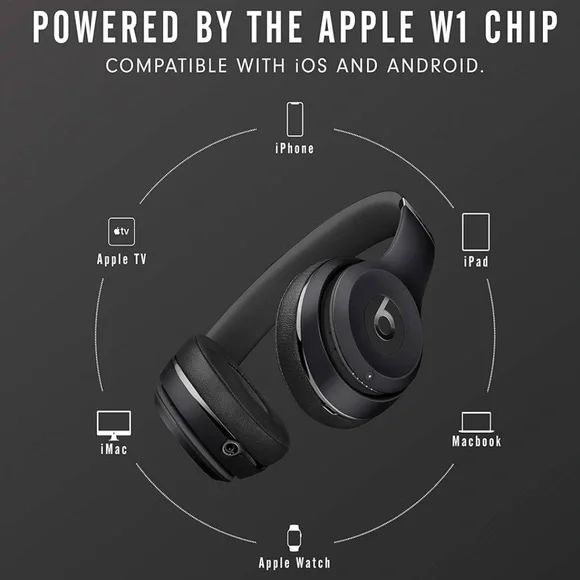 With up to 40 hours of battery life, Beats Solo3 Wireless is your perfect everyday headphone. With Fast Fuel, a 5-minute charge gives you 3 hours of playback. Enjoy award-winning Beats sound with Class 1 Bluetooth® wireless listening freedom. The on-ear, cushioned ear cups are adjustable so you can customize your fit for all-day comfort.DRIVEN BY THE APPLE W1 CHIPIncorporating the efficient Apple W1 chip brings seamless setup and switching for your Apple devices,* up to 40 hours of battery life, and Fast Fuel technology for 3 hours of play with a 5-minute charge.WIRELESS THE WAY IT SHOULD BEBeats Solo3 Wireless headphones are ready to go when you are. They instantly set up—just power on and hold near your iPhone—then simultaneously connect to your Apple Watch, iPad, and Mac*. The Apple W1 chip features Class 1 Bluetooth® connectivity, the industry-leading classification for range and signal strength. With this best-in-class pairing technology, you can seamlessly sync to your devices, so you can easily move about and keep the music going.