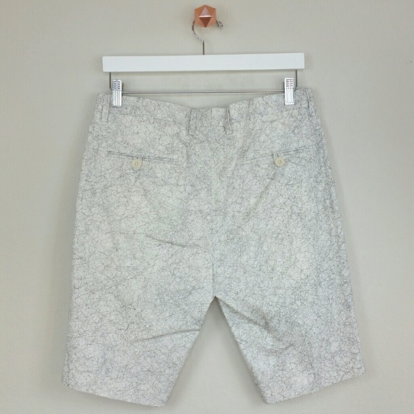 Woven cotton-blend shorts. Print throughout. Belt loops. Side slant pockets. Back welt pockets with button closure. Tonal top stitching and panel seaming. Hidden hook closure with zip fly. Size: 32. Rise: 11". Inseam: 9.5". Leg opening: 18".Color: white-black print.CLXXVNWT. Never worn. Can provide more pictures and info upon request.