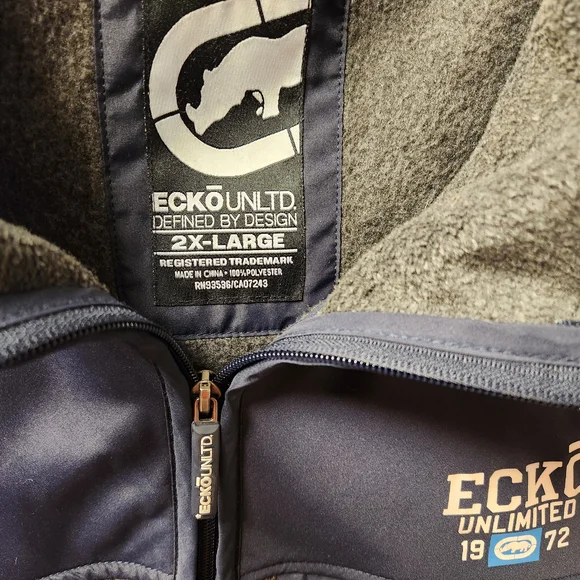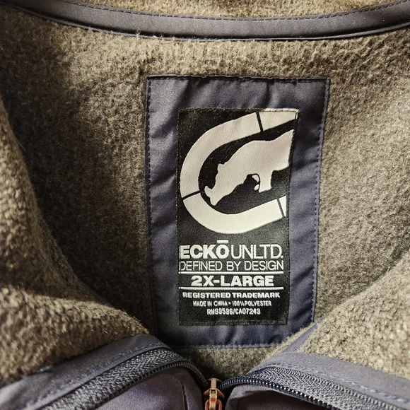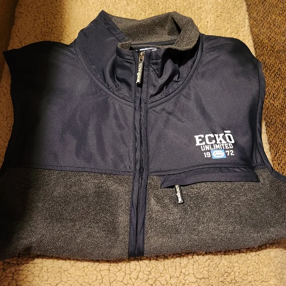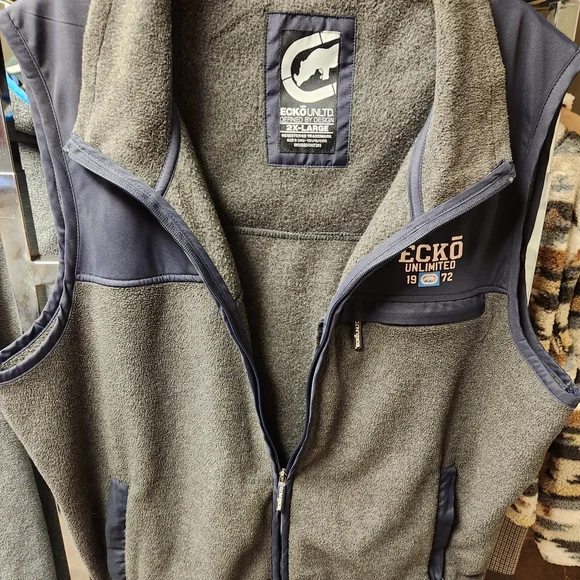 Stylish Ecko Unlimited vest. Features gray fleece body. Navy accents and zipper. Perfect for layering.