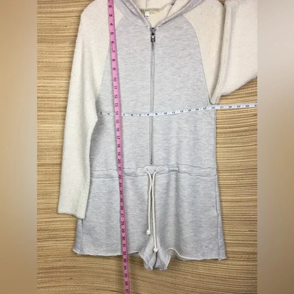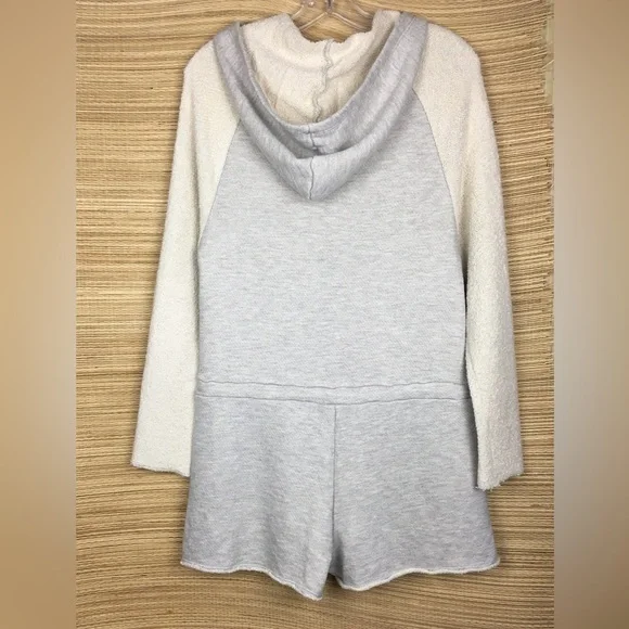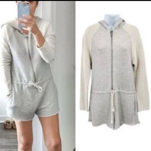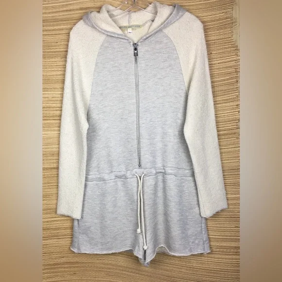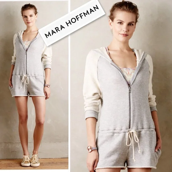 Mara Hoffman Active Terry RomperHeather Gray and Oatmeal Tan Long Sleeve Hood Half Zip Up Drawstring Waist To Cinch Waist For a More Fitted Look Shorts, Pockets Sweatshirt Fleece Material OversizedLoose Fit lSize S Excellent, like new condition. Please use my photos as part of description. Due to different camera and light color of the item can be slightly different.L