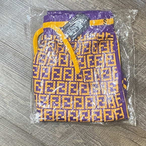 Chinatown Market Secret Club Monogram Mesh Shorts Size small Color is a beautiful color block of Purple and Yellow.Designed in Los AngelesCustom cut & sew Heavyweight jersey mesh Elastic waistband with drawcordSide pockets and back pocket