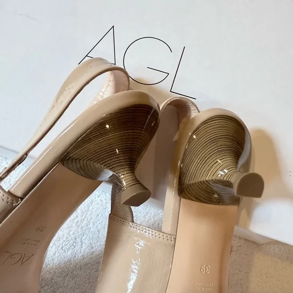 Chic nude patent leather heels by AGL. Sleek and versatile design. New in box. Comfy low heel.
