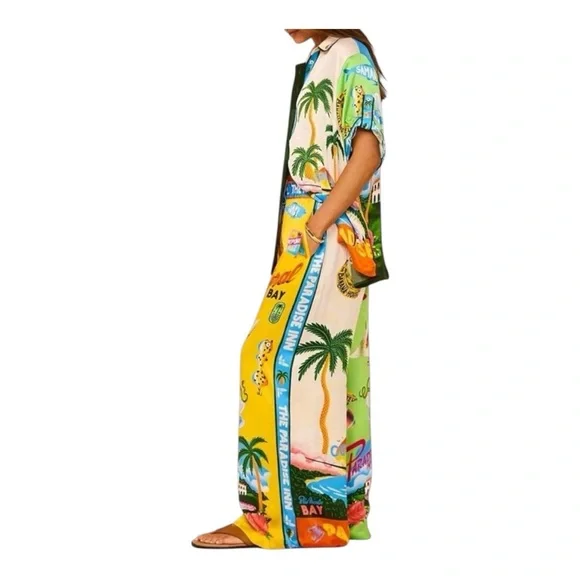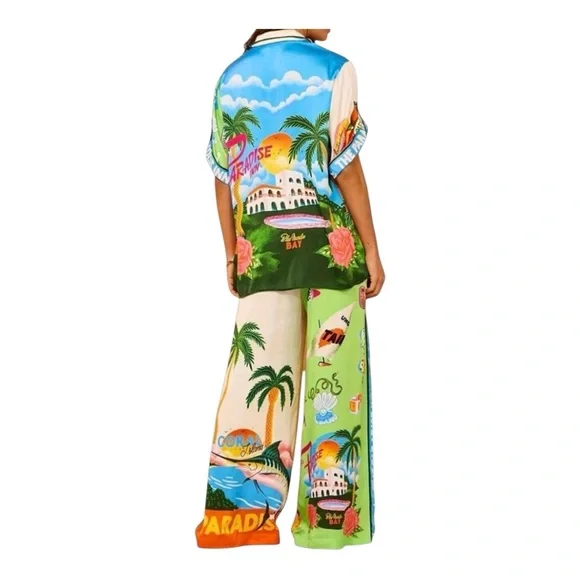 Perbai 2 Piece Sets Short Sleeve Button Down Shirt Wide Leg Pants Boho Size S Nw