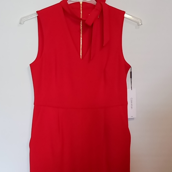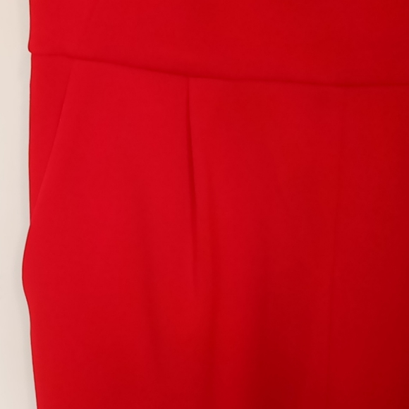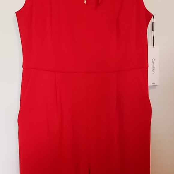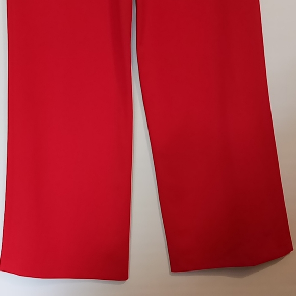 Halter V-neck Sleeveless JumpsuitWomen´s size 10 or 14Red. Comfortable Tie at the neckWide Leg2 front pocketsPoly blend fabricGold Logo zipper down back2 vertical darts on the frontTag says Dry Clean onlysize 1018"´ across chest just below armpits16" across waist16" top back to waist seam45" waist to cuff32" inseamNOTE:The size 10 has some very light discolorationon the back of one leg at the bottom.See last picturesize 1420" across chest.17 1/2" across waist16" top back to waist seam46" waist to cuff.32" inseamBrand new with tags