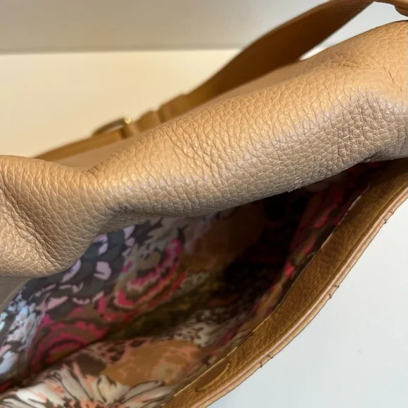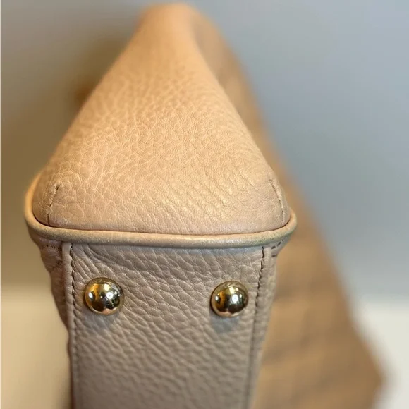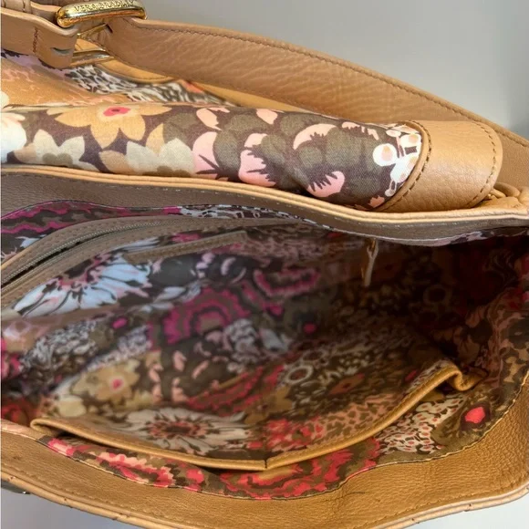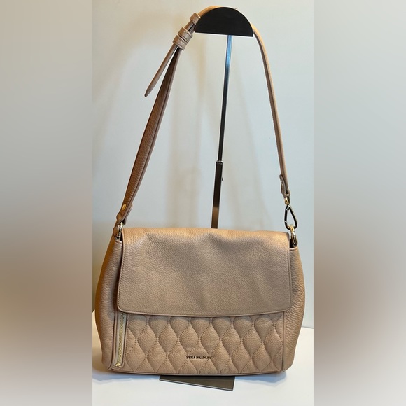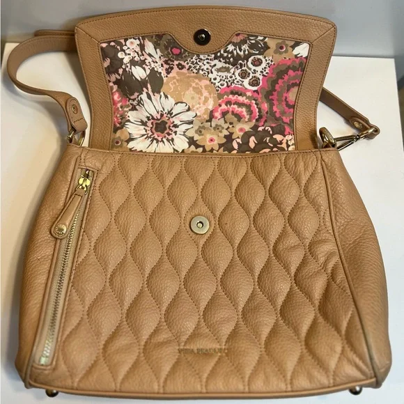 This Vera Bradley Cara soft Leather adjustable Shoulder Bag is a versatile and stylish accessory for any occasion. With a solid quilted pattern and a Nude exterior color, this medium-sized bag features a magnetic snap closure, gold hardware, and an adjustable leather strap. The bag has a fabric lining, bottom studs, and inner pockets for added organization. It measures 12 inches in width, 9 inches in height, and 3 inches in depth. The bag is perfect for travel, weddings, casual outings, workwear, or business settings. See pictures for some minor wear. Beautiful Bag!