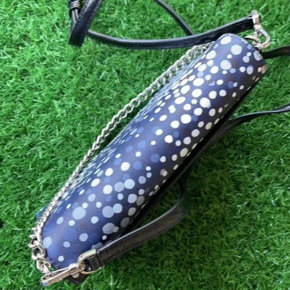 Kate Spade Cameron Convertible Crossbody Black with Multi-Colored DotsColors: Blue, white, black, gray dots5.7"h x 9.1"w x 2.6"ddrop length: 22"two way spade jacquard liningtrim: saffianometal pinmountcrossbody with snap closureinterior slide pocketdust bag not includedimportedstyle # wkru6361