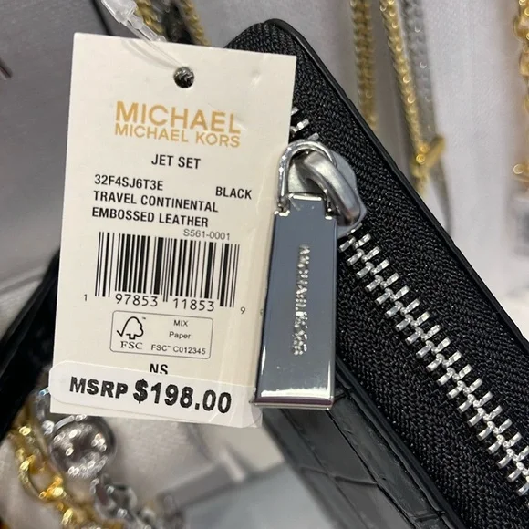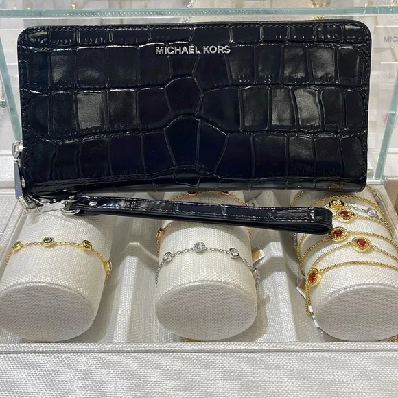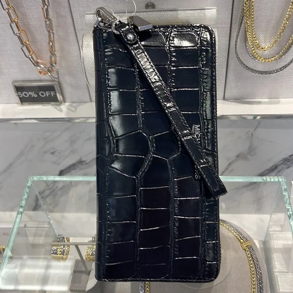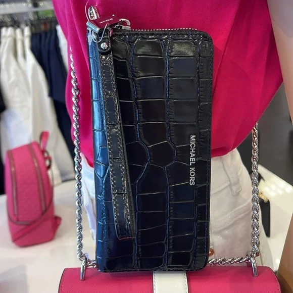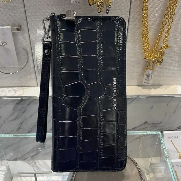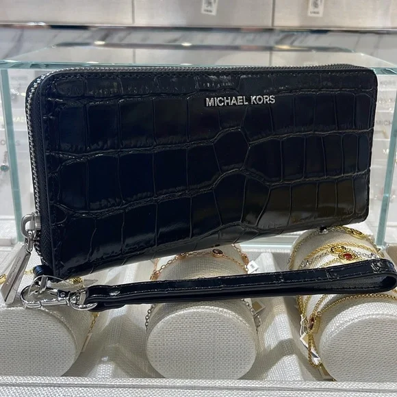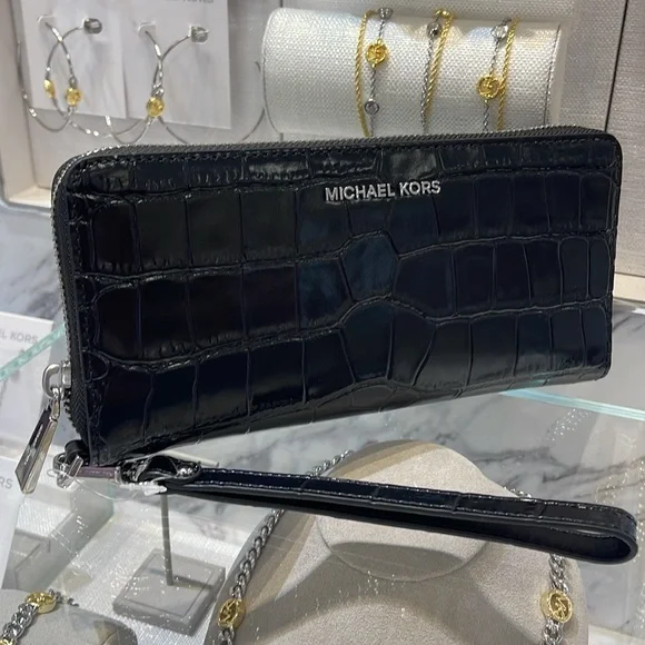 Michael Kors Jet Set Travel Metallic Crocodile Embossed Leather Continental Wallet Black NWTAuthentic Constructed from crocodile-embossed leather with a patent finish, this sleek wallet is the perfect all-in-one accessory. It features a dedicated pocket for your phone and a wealth of card slots for easy organization. A must-have when traveling or commuting, it can easily be tucked into your carryall or worn as a wristlet.• Wallet• Metallic crocodile-embossed leather• 100% leather• Silver-tone hardware• 8.25"W X 4"H X 1"D• Interior details: 5 slip pockets, zip pocket, 17 card slots• Lining: 100% polyester• Zip fastening• Imported• Style # 32F4SJ6T3E