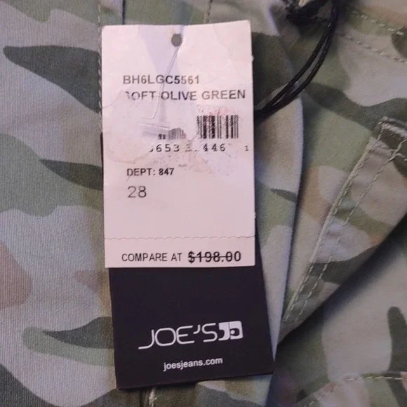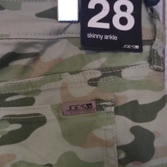 New With Tags MSRP $198Joe´s Jeans The Icon Camo Ankle Skinny Jeans 6/28 in Soft Olive Green CamoA stylish skinny leg completes this camo printed jean, perfect for a chic look.Flawless fit for every shape. The Icon Ankle Cut in soft olive green camo features belt loops, dual front pockets, dual side cargo pockets and dual back pockets. Zip fly with button closure. 5-pocket construction. Skinny leg. Camo print.Leg opening has an approximate 10in circumference. Machine wash cold 98% cotton, 2% spandex.Fit: this style fits true to size. Sizing: 28=6Approximate Flat Lay Manual MeasurementsWaist 15"Hip 17"Rise 10"Inseam 27"Length 37"