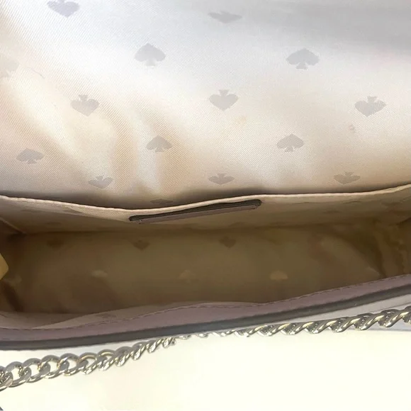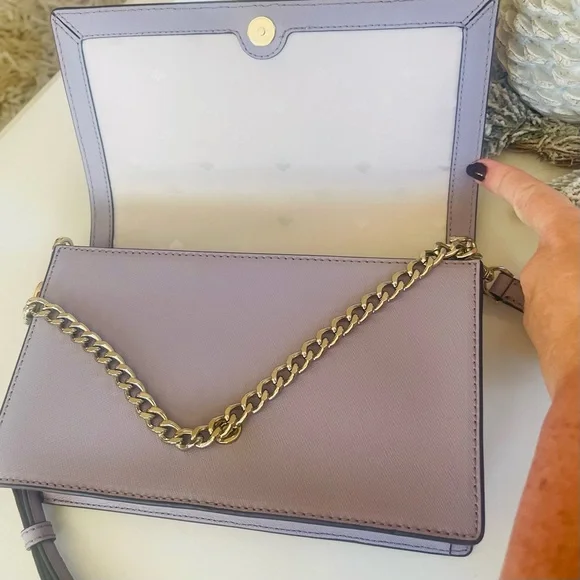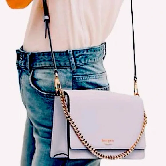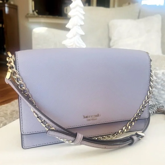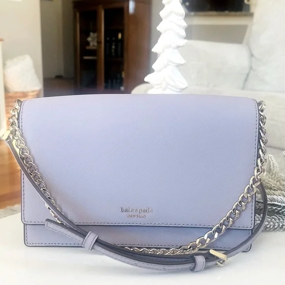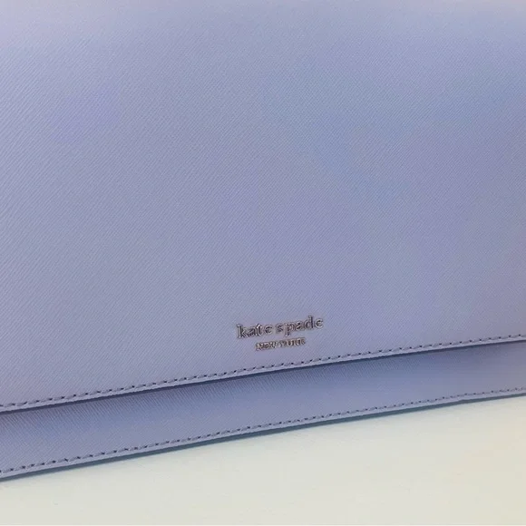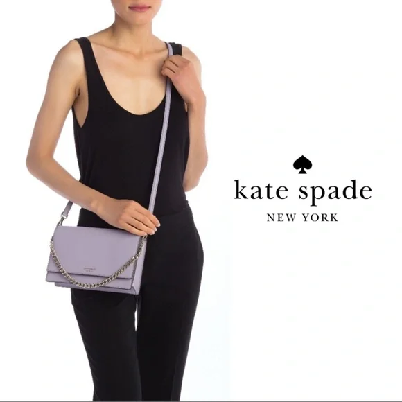 KATE SPADE Cameron Carson Convertible Crossbody Bag Icy Lavendar Silver Chain Purse. Saffiano leather exterior. Never carried! Plastic still attached but no actual tag. Color is so lovely in soft lavender with grey undertones. Very soft color. Magnetic flap front closure; rear slip pocket Interior features two way spade jacquard lining and one full length slip pocket Adjustable, removable leather strap with 19-23" drop for crossbody or shoulder use; gold chain for handbag use can also be slipped inside bag for clutch use.Measurement:Approximate dimensions: 5.7"H x 9.1"W x 2.6"DStyle No:WKRU5843Smoke/pet free environmentneutral, everyday bag, Designer, Luxury, Leather, Classy, Trendy, Chic, Classic, Everyday Bag, Date Night, Casual, Career, Business Casual, Workwear, Professional, Careercore, Office, Work, Careerwear, Evening, Event, Evening Wear, Cruise, Cocktail, Wedding Guest, Bridesmaid, Bridal Shower, Baby Shower, Special Occasion, Bachelorette, Wedding Shower, Graduation, Clubbing, Glam, Rave, Statement, Travel, Barbie, Holiday, Red Carpet, Celebrity, Tik Tok, Famous, Femme, Glam, Shiny, Glamorous, High End, Influencer Favorite, Jennifer Lopez, Taylor Swift, Christmas, Valentine´s Day, Gift, Romantic, Flirty, Goddesses, Bachelorette Weekend, Prom, Luxe, Vogue, Runway, Neutral, Preppy, New York, NYC, After Hours, Business Meeting, Queen, Streetwear, Runway, Hard to Find, Rare, Day Bag, Office Bag, All Day, Best Seller, Hot