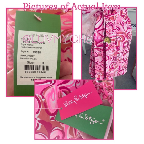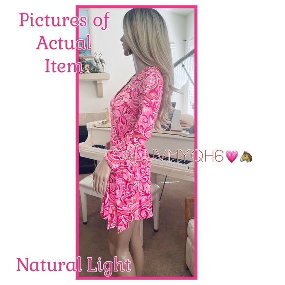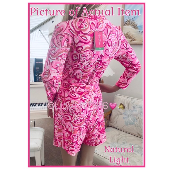 Lilly Pulitzer Pink Pout Mango Salsa Karlie Printed Wrap Romper/Dress Combo! This flattering shape comes in a perfectly flowy-yet-weighty spandex jersey. With 3/4 Length Sleeves. Size Small. Measurements Approximately (laying flat), Length Shoulder Seam down 29 in. Waist adjustable (with Strap) 13.5in. Inseam 5in. Material - 96% Rayon, 4% Spandex. Care - Hand Wash Cold. NEW With Tags!