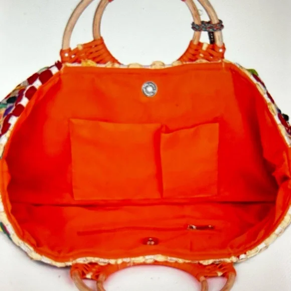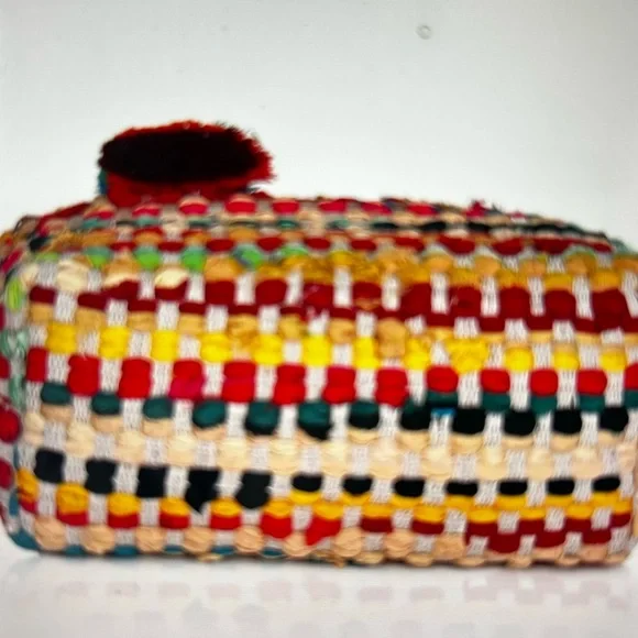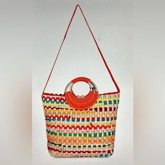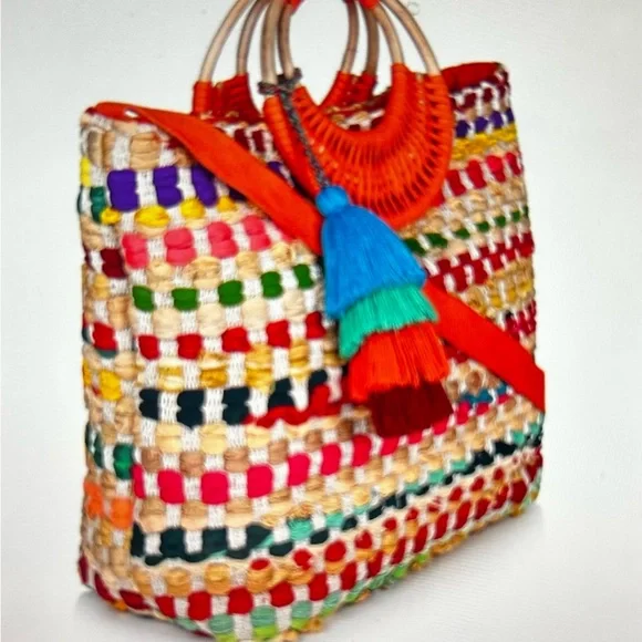 Brand New!! Direct from the factory wrapped in factory packaging. Beautiful boutique quality multi-purpose tote bag by America & Beyond. Handweaved fabrics, lined interiors, magnetic closure, interior zip pocket & slip pocket Long strap Macramed wicker ring handles Multi colored tassel Bag is 50% cotton & 50% polyMeasures 12.5H x 18.25W x 7D