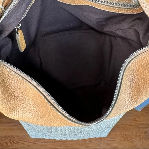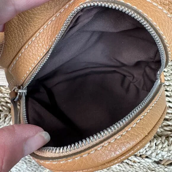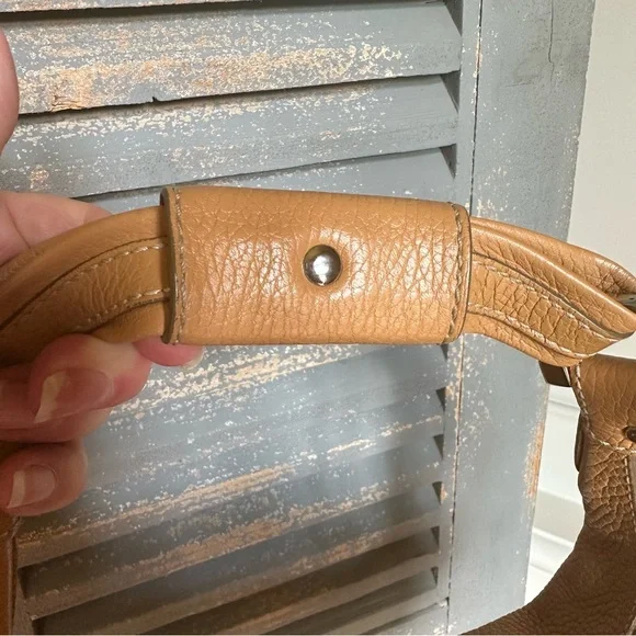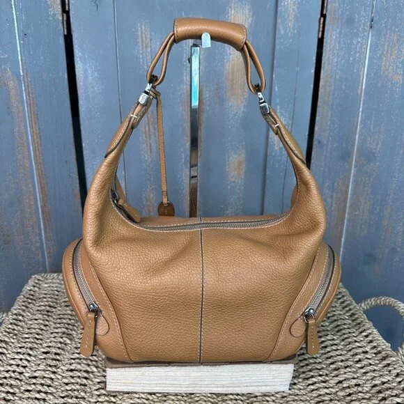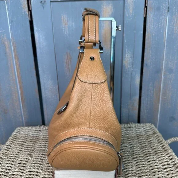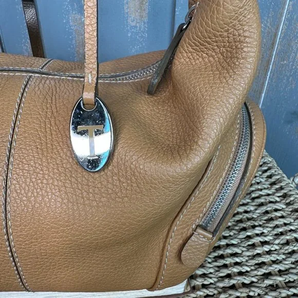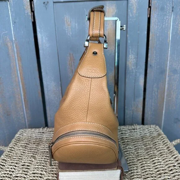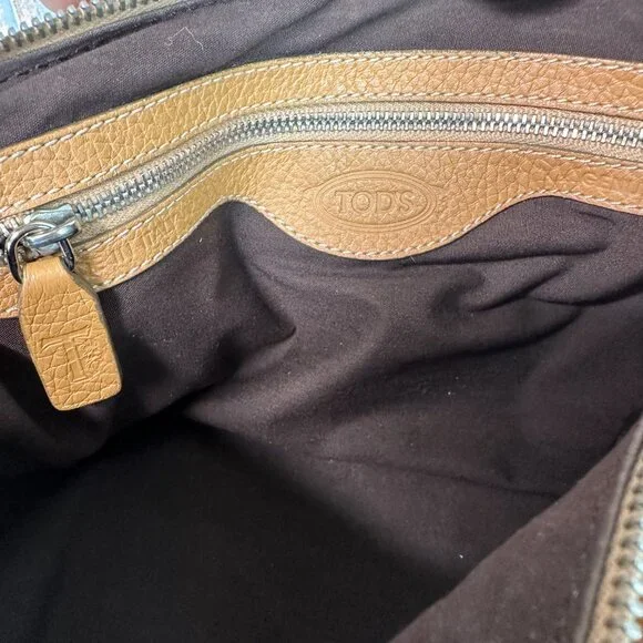 EUCCamel Pebbled LeatherSilver tone hardwareShoulder strap with fold over carry padEmbossed leather and engraved hardware logo detailsZip top closureOne long Tod´s branded...