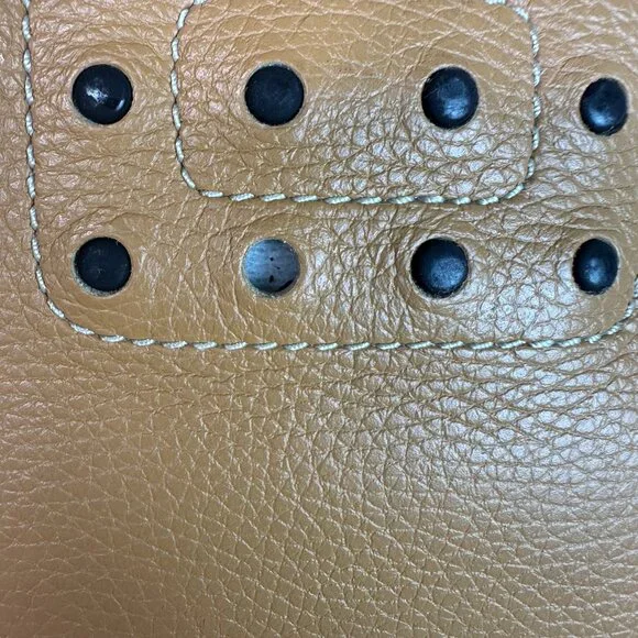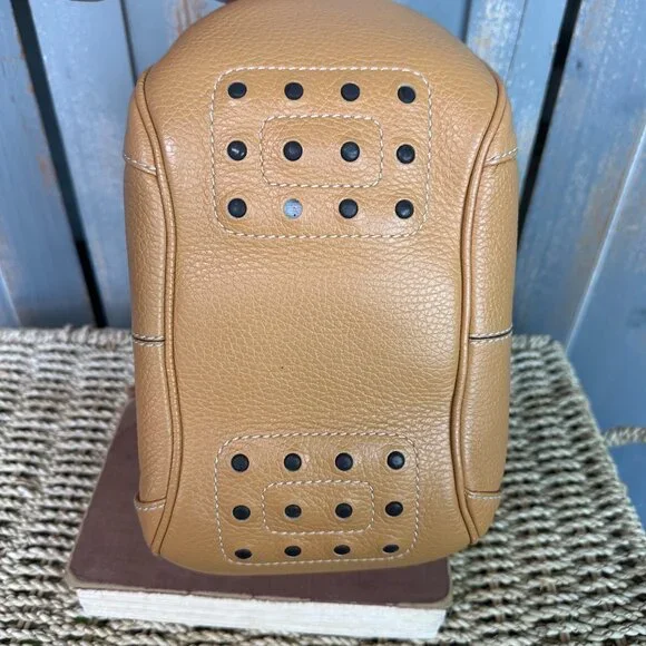 EUCCamel Pebbled LeatherSilver tone hardwareShoulder strap with fold over carry padEmbossed leather and engraved hardware logo detailsZip top closureOne long Tod´s branded metal tag Zip closure side pocketsPeg feetBrown fabric liningBack wall zip pocket with "T" zip pull and Tod´s embossed logoMissing one peg at bottom -- see pic 7 and last picApprox measurements:13"W x 6 1/2"H x 6 1/2"DStrap drop: 6 1/2"
