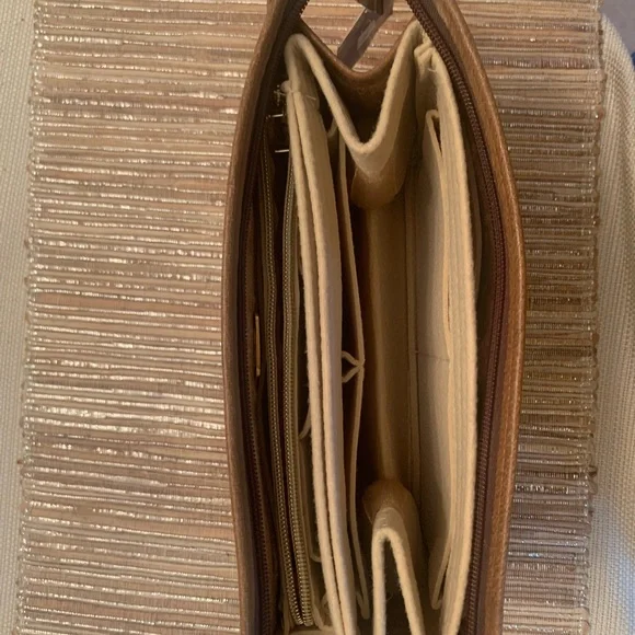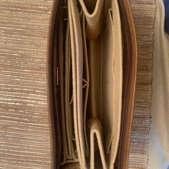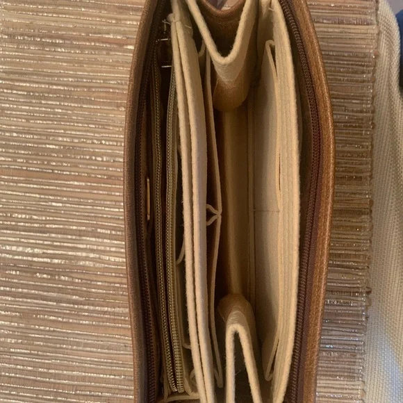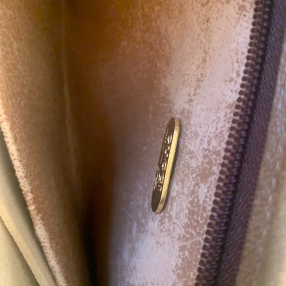 Preloved GG clutch. Has beautiful authentic emblems that are golden. Clutch arrived to me in beginning stages of powdery peeling on walls inside. I cleaned and conditioned the bag now it just has dry white marks no more peeling. I fitted the bag with a new bag organizer , just if you don´t want to see white spots. It does close but with organizer in I don´t close all the way to end because it is fuller towards that end. Organizer can be taken out or left in