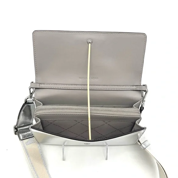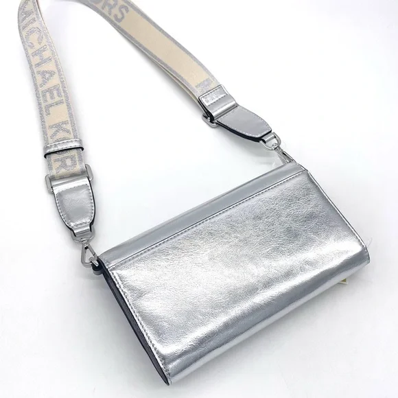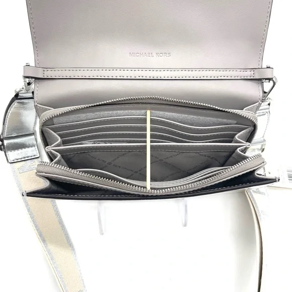 Brand new with TagMichael Kors Large Zip Around Wallet Xbody Bag Leather• Silver-tone hardware• 8”W X 5” H X 2”DColor: SilverWallet Interior details:12 card slots, 4...