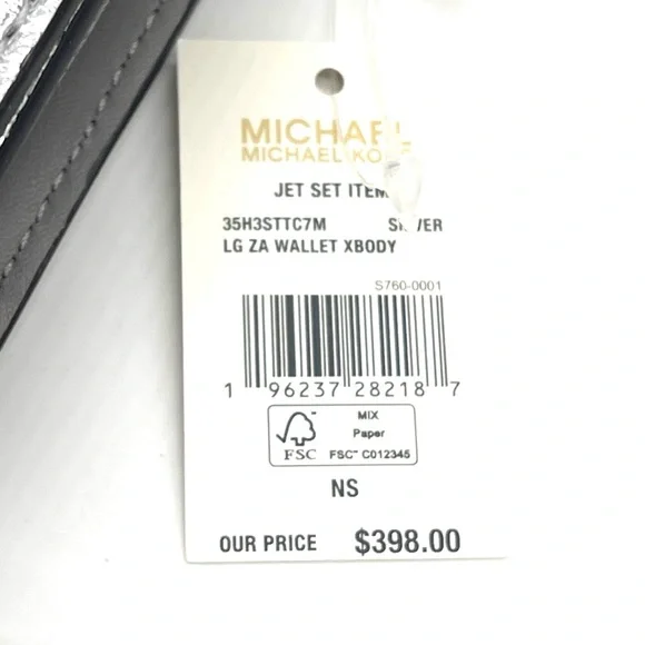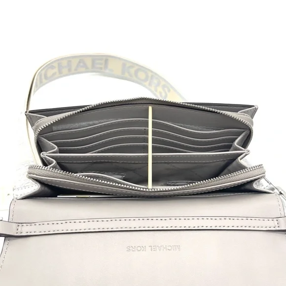 Brand new with TagMichael Kors Large Zip Around Wallet Xbody Bag Leather• Silver-tone hardware• 8”W X 5” H X 2”DColor: SilverWallet Interior details:12 card slots, 4 slip pockets, zip pouch, phone pocket• Lining: 100% polyester• Zip fastening• Imported