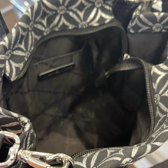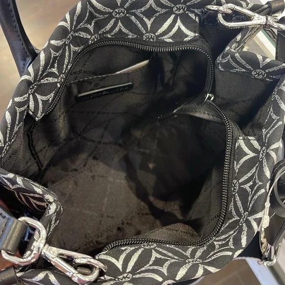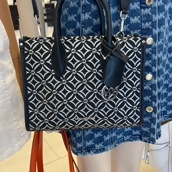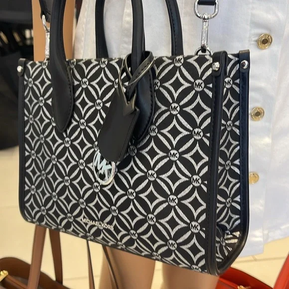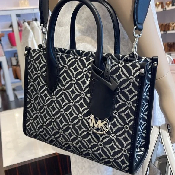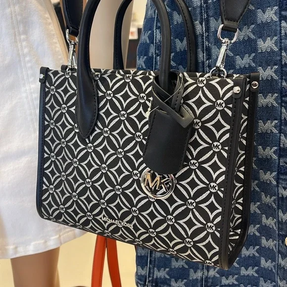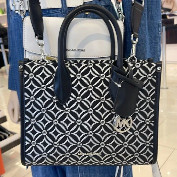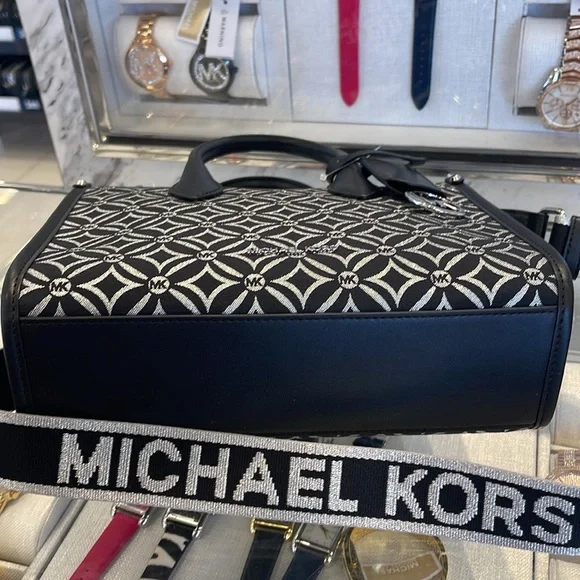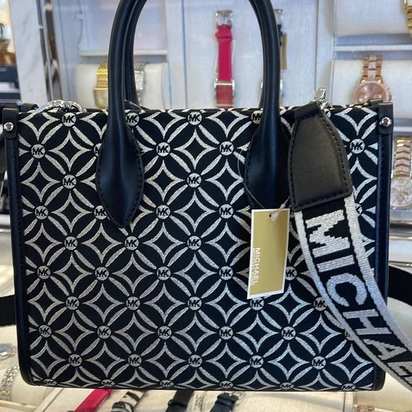 Elevate your style with this chic Michael Kors bag, featuring a striking black and white pattern. Perfect for any occasion, this bag combines elegance with functionality.Michael Kors Mirella Small Metallic Logo Jacquard Crossbody Bag Black/Silver NWTAuthentic Woven with a kaleidoscopic take on our initials, the Mirella crossbody bag features light-catching metallic threads and a polished MK charm. Its compact size is perfect for days about town. Carry it by the smooth top handles or over the shoulder via the detachable logo-tape strap.• Crossbody bag• Logo jacquard• 63.7% polyester/36.3% cotton• Trim: 60% polyurethane/20% cotton/20% polyester• Silver-tone hardware• 9.25”W X 7.75”H X 3.75”D• Handle drop: 3.25”• Adjustable strap: 20.25”-23.75”• Interior details: back zip pocket• Lining: 100% polyester• Zip fastening• Dust bag not included• Imported• Style # 35F4S7ZC5J