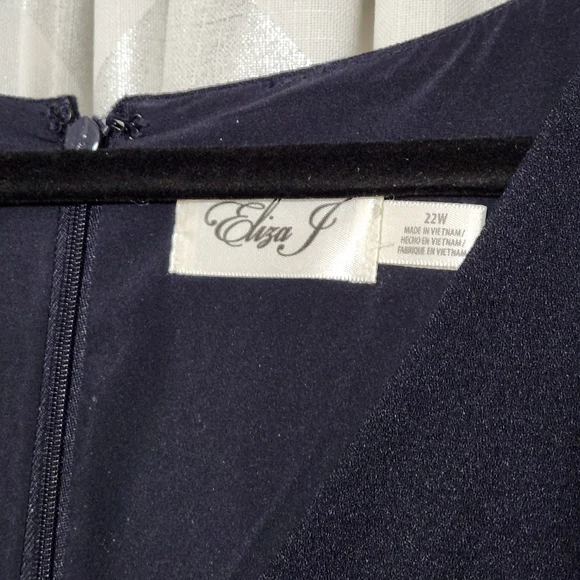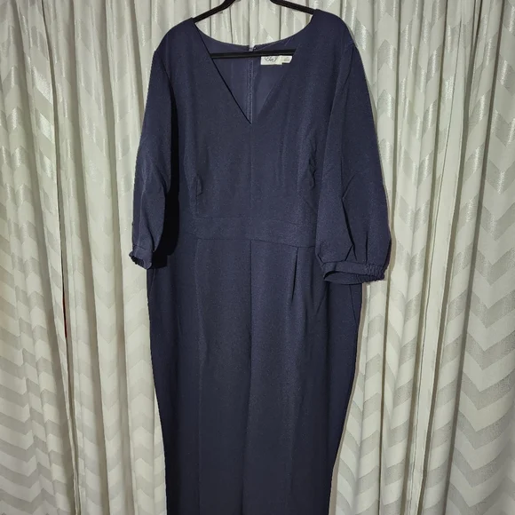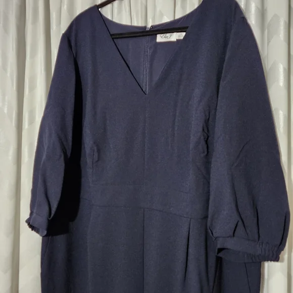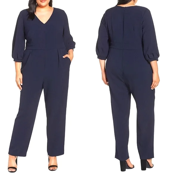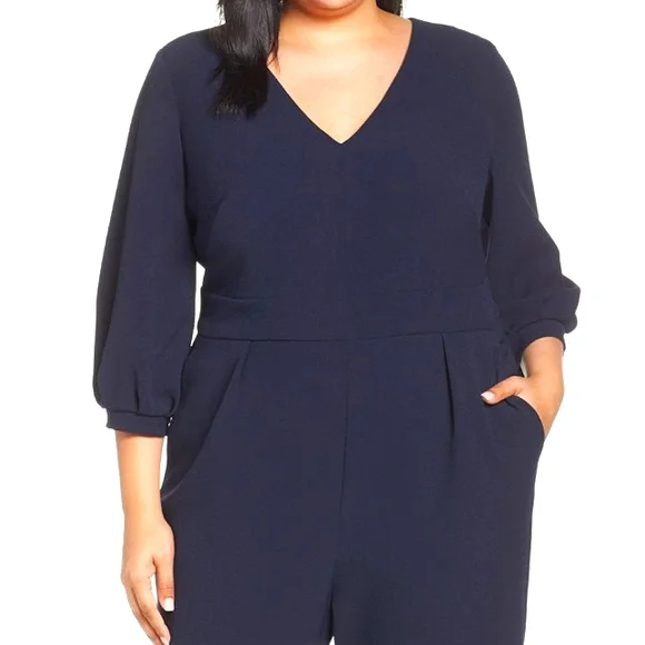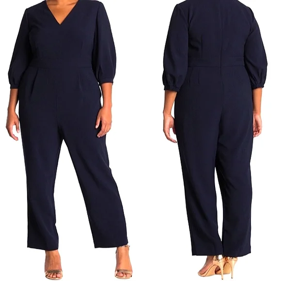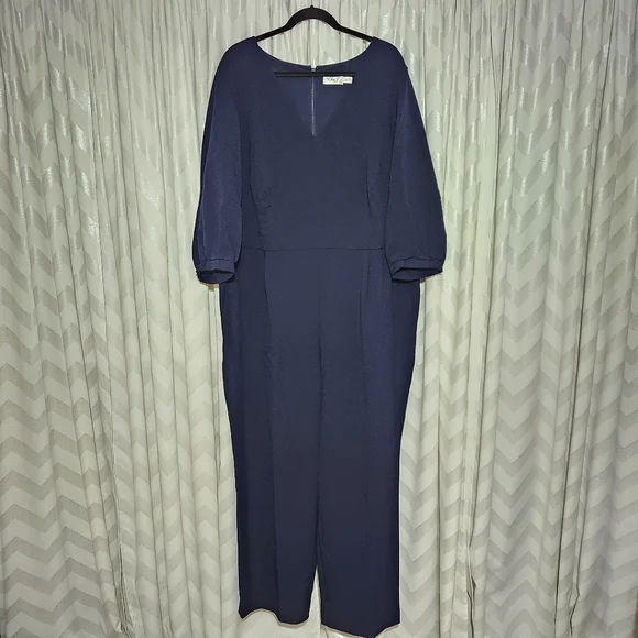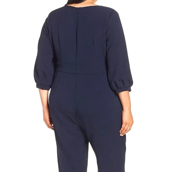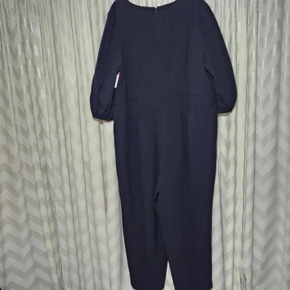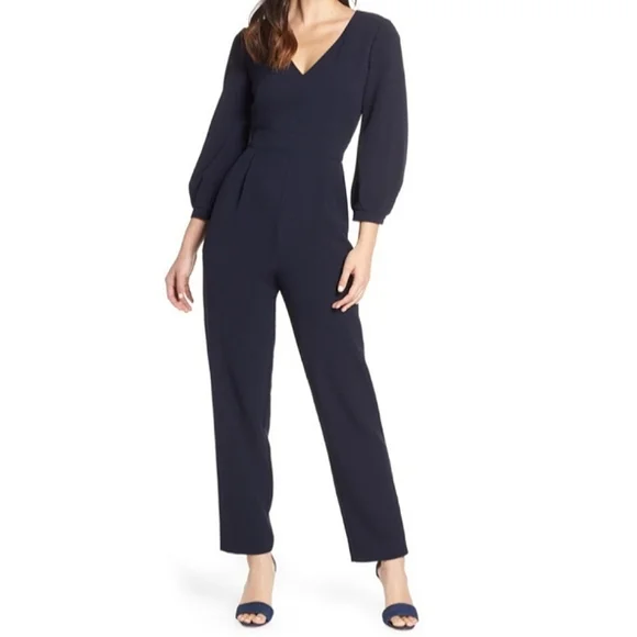 Eliza J jumpsuit in a navy blue crepe material. 3/4 inch balloon sleeves. Has pockets and back zipper closure.Brand new, part of tag was removed.