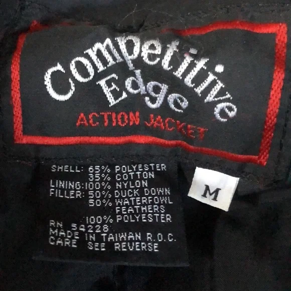 Vintage Competitive Edge duck down and waterfowl-filled vest. Very warm and has multiple pockets. Front zipper and snap closure. Backstretch with adjustable side snaps.