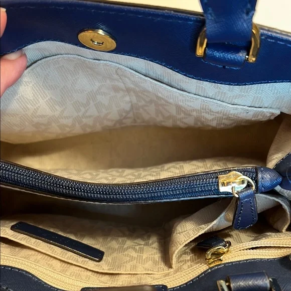 This Michael Kors bag would be perfect for any occasion and would even go great with blue jeans. Handle drop is 3.75”. Gold hardware, snap closure top, clean inside. Does not...