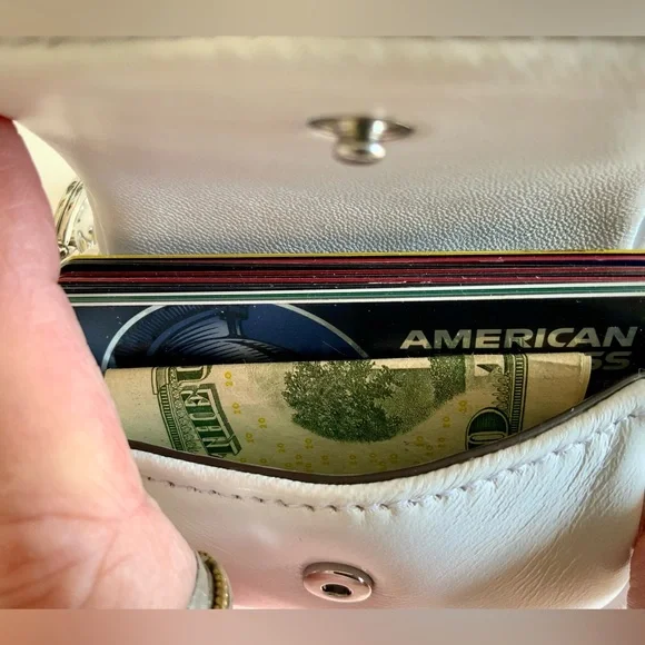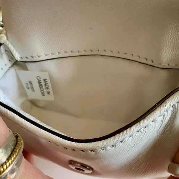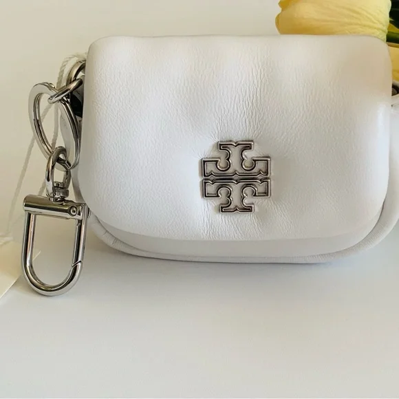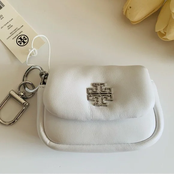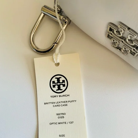 Brand new with tag, Tory Burch Britten Leather Puffy Card Case in color Optic White, and not to be confused with the nylon version. Stunningly gorgeous, super soft leather card case features silver tone hardware, the Britten silver tone metal logo at the front, key fob and split ring key ring, nice to clip inside (or outside) of your bag. I have it pictured holding 10 credit cards plus folding cash, a great grab and go card case. I love the puffy leather, so smooth and supple. Front snap flap closure, measures approximately 4” x 2.5” x 1” deep.