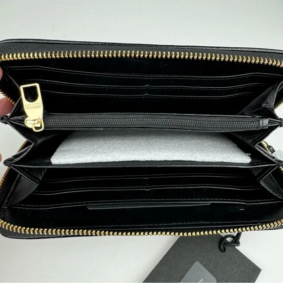 Emblazoned logo letters dial up the impact on this shiny patent wallet.Zip-around closureGoldtone hardwareOne inside zip pocketTwo inside bill compartments12 inside card slotsLinedPolyurethane7.5"W x 4"H x 0.75"DMy environment is smoke free and pet freeReady to be shipped, same/next business dayPlease let me know if you have any questions! Thank you so much!