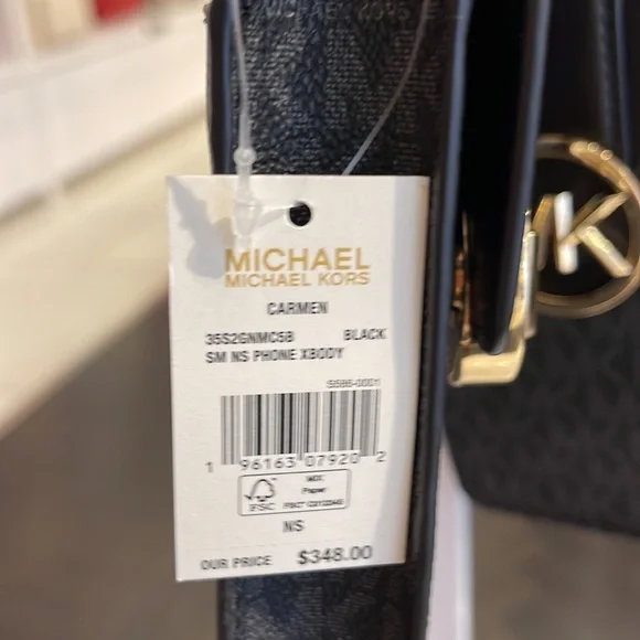 Michael Kors Carmen Small Logo Smartphone Crossbody BagBlack Reimagined in a shrunken silhouette, this version of our beloved Carmen bag will stylishly keep your phone and card case within arm’s reach. It’s designed in our instantly recognizable Signature-print canvas with contrasting faux leather panels. The high-shine hardware amps up the luxe factor, while its crossbody strap can be adjusted to the perfect length. Wear it from day to dark with ease.DETAILS• Crossbody bag • Logo-print canvas • 89.4% coated canvas/9.6% polyester/1% polyurethane • Trim: 100% polyurethane • Gold-tone hardware • 4.25”W X 7”H X 1.25”D • Interior details: 3 card slots • Lining: 100% polyester • Snap fastening • Imported