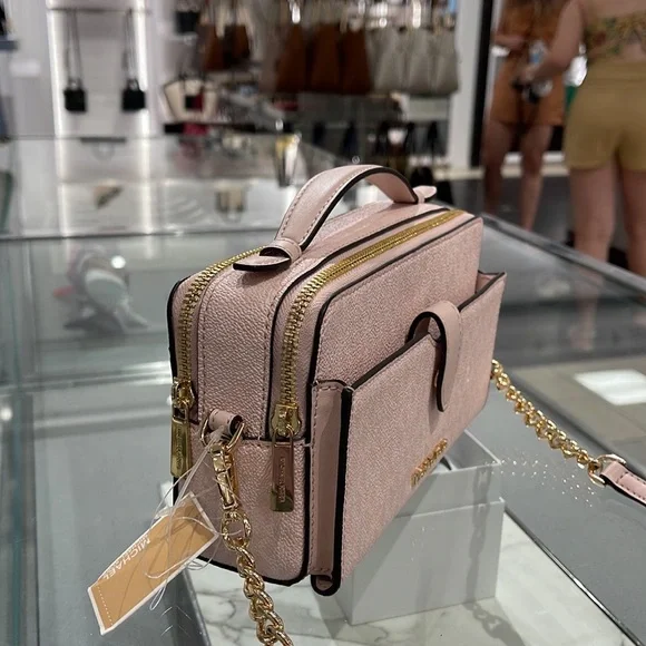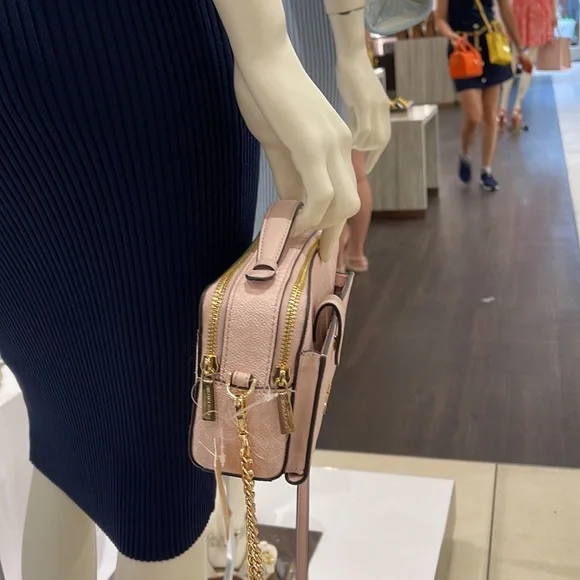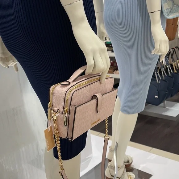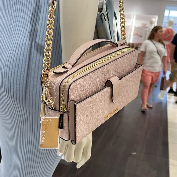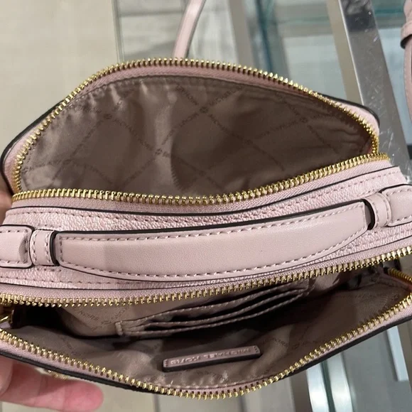 Michael Kors Women Medium Double Zip Phone CrossbodyLight Powder Blush Signature New with tag. Authentic Michael Kors Women Fashion Medium Zip Phone Crossbody Handbag Purse Shoulder Messenger BagLight Powder Blush SignatureDetails • Gold tone hardware • Exterior details: back slip pocket, 1 phone pocket in front of, 2 zip pockets , removable crossbody strap • Interior details: back slip pocket, 3 card slots • Lining: 100% polyester • Zip fastening • 7.7" W * 4.7" H * 2.5"D