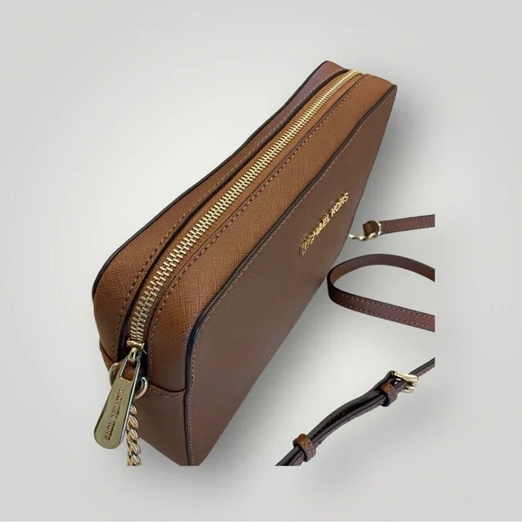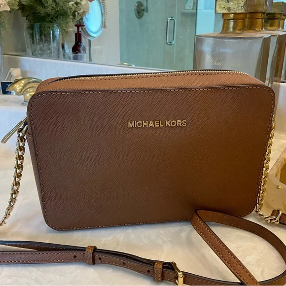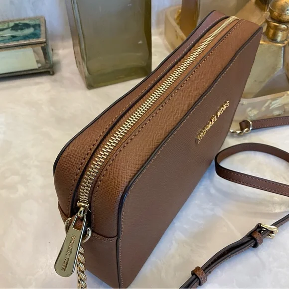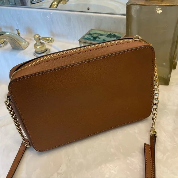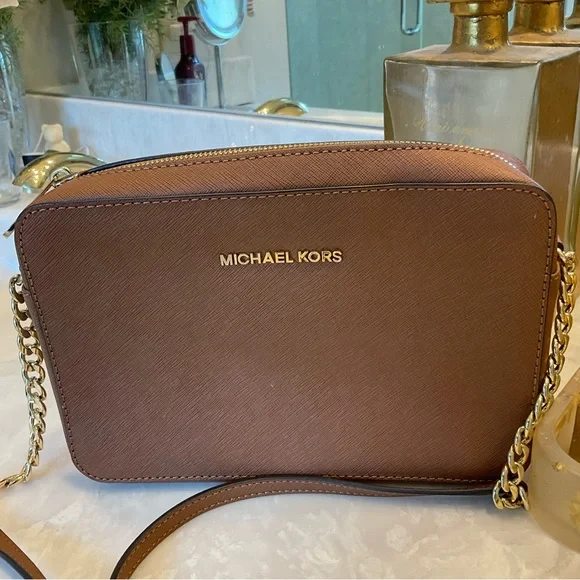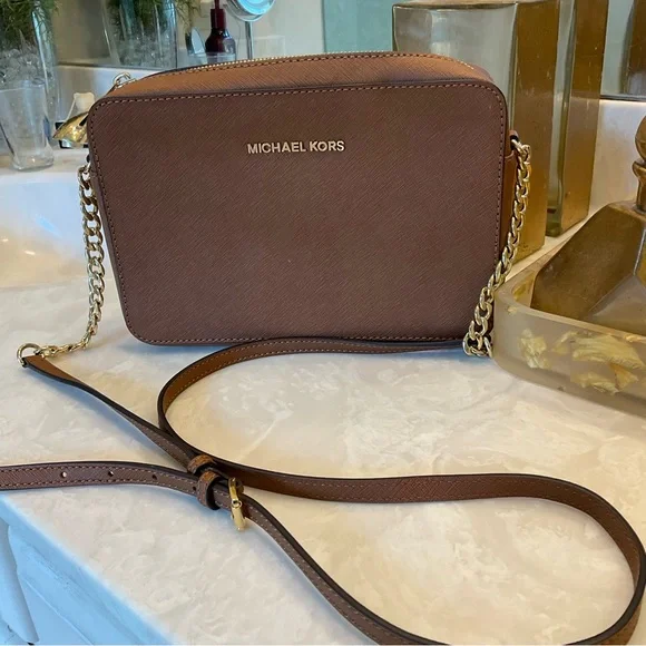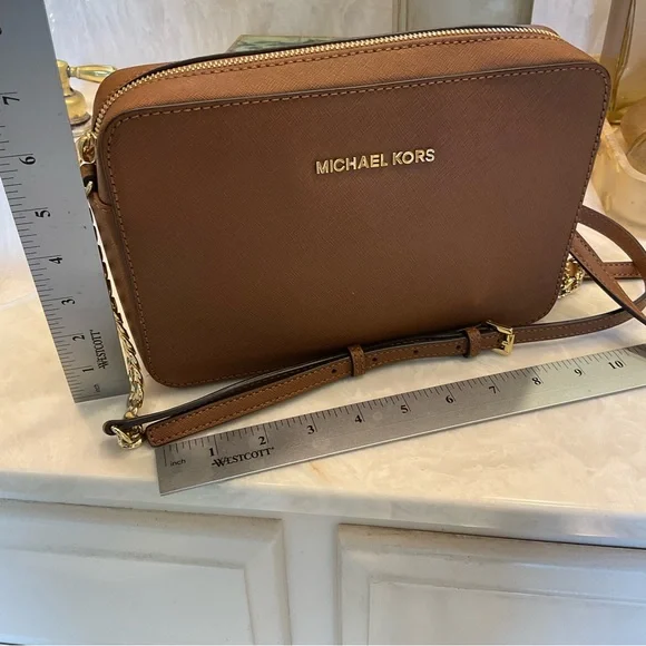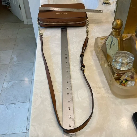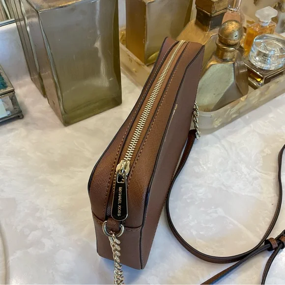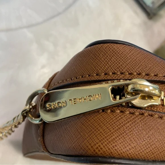 Michael Kors Crossbody / Shoulder bag Pebbled leather 100% leather from tanneries meeting the highest standards of environmental performance Trim: 60% polyurethane/20% cotton/20% polyester Gold-tone hardware 9”W X 7”H X 3”D Handle drop: 21” Exterior details: Michael Kors gold logo nameInterior details: back pocket, front slip pocketsShoulder strap with gold chain detail and buckle to shorten or lengthenLining: 100% polyester Zip fastening ImportedRetail price: $398Excellent condition
