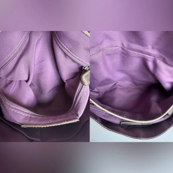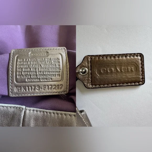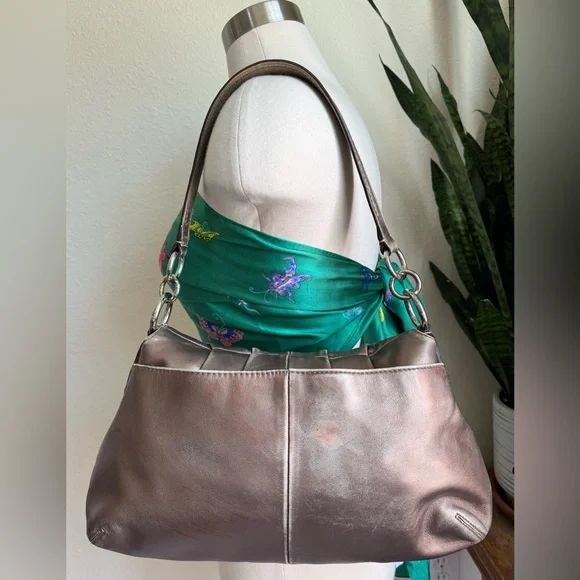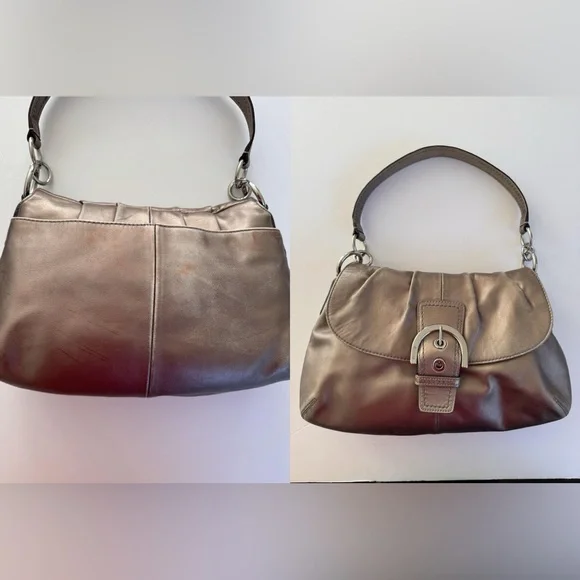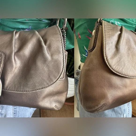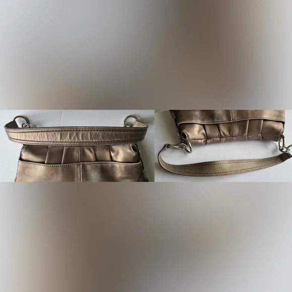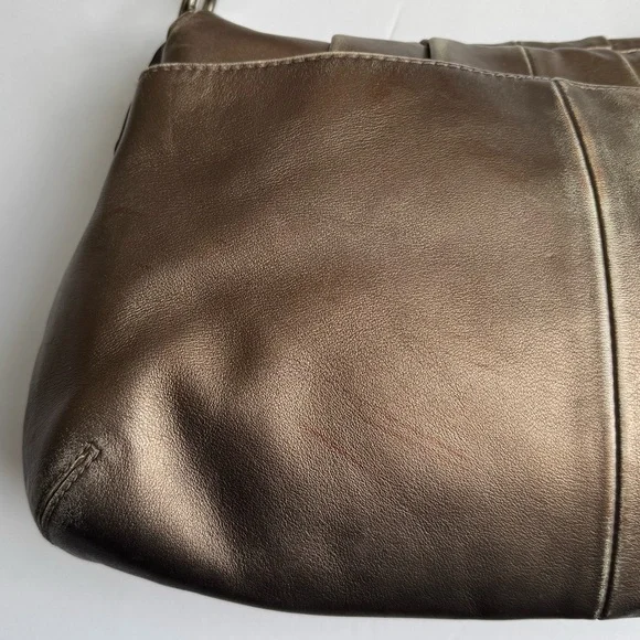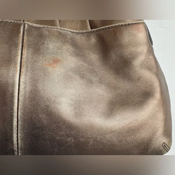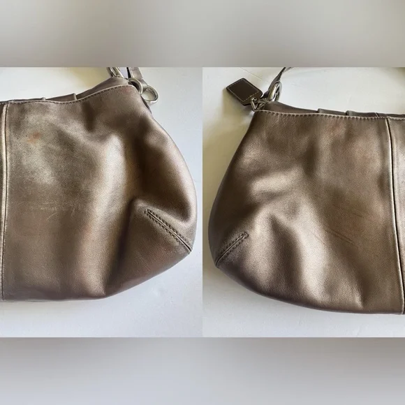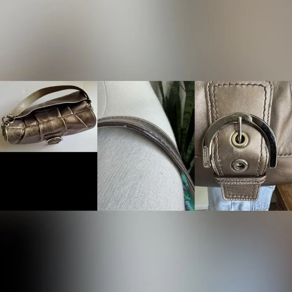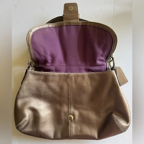 Condition:Good preloved condition – wear on the back-red tint markings on the back, and natural fading on the strap and around base from use. The bronze finish shows surface wear that adds to its character without affecting function or beauty. Please see pictures as part of description. Coach Soho metallic leather shoulder bag with luxe pleated design, purple lining, and buckle detail. Rare style with a rich bronze patina and timeless silhouette.Measurements (approximate):Length: 9.5”Width: 14.5”Strap Drop: 9”Features & Extras:Material: Full-grain leatherLining: Plum-toned Closures: Magnetic flap with buckle accentAdditional details: Interior zip pocket, slip pockets, leather Coach creed patchComes with: Matching Coach hangtagTags:vintage, Coach, Y2K, metallic purse, shoulder bag, boho, classic, leather bag, preppy, quiet luxury, 2000s, hobo bag, rare Coach style, pleated bag, everyday purse, festival style, soho coach bagPet-free/Smoke-free home.Questions? Feel free to leave a message or comment. I’m happy to help!Open to offers and I love bundles:-)Thank you for taking the time to look.