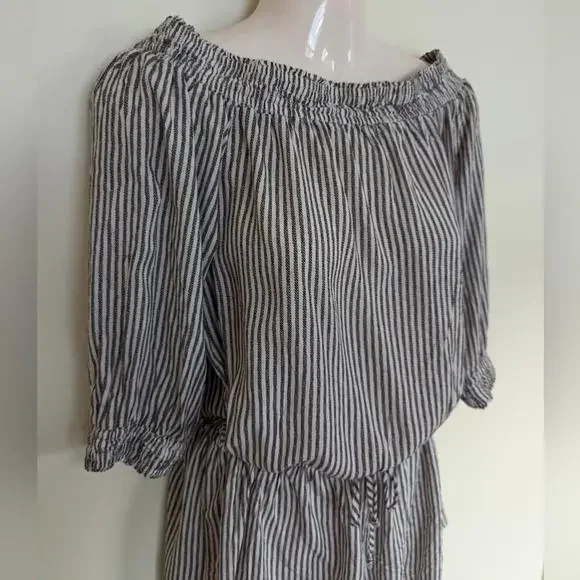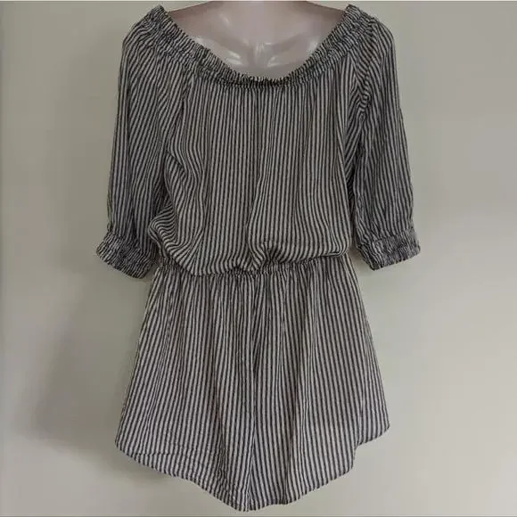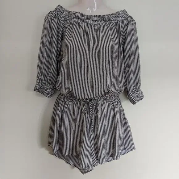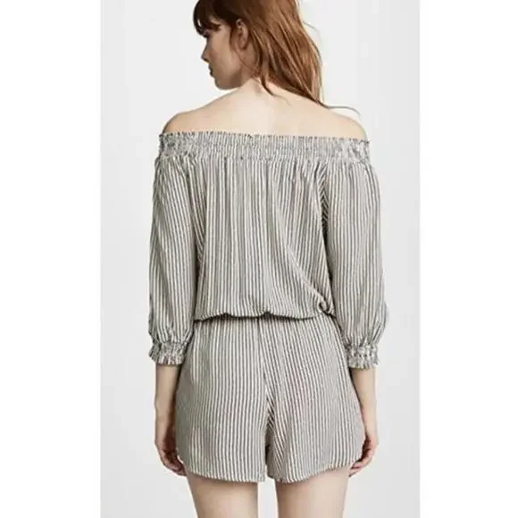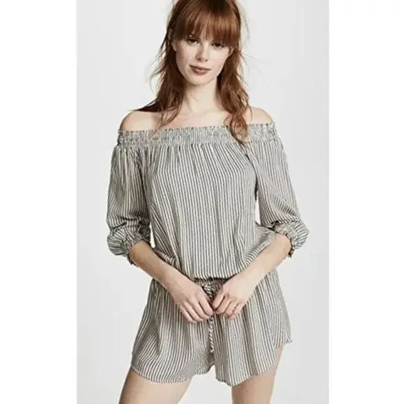 very good used condition - faint mark as picturedoff the shoulder stylesmockedelastic and drawstring waist short one piece romper outfitlightweightpull on stylerevolve, high quality, designer, comfort, easy, one piece, jumpsuit, vacation, travel, cruise, resort, pool swim, casual relaxed