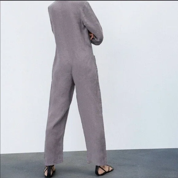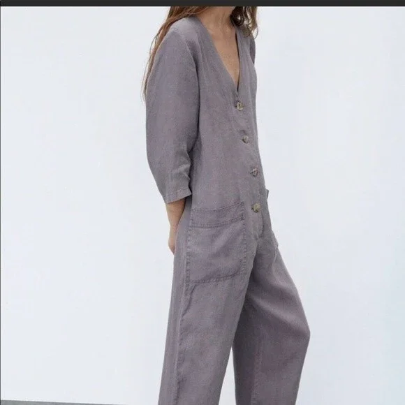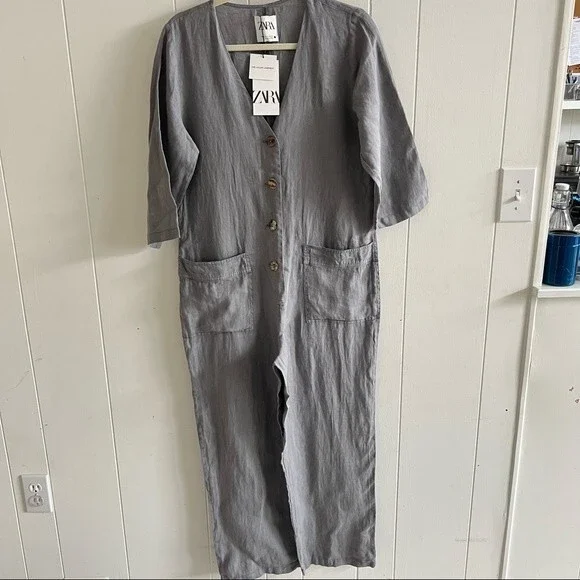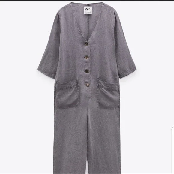 NWT Zara Lillian Gray Linen button front 3/4 sleeve jumpsuit. Trendy, chic and comfortable linen jumpsuit with slip on button front entry.Smoke and pet free home. Please review all photos before purchase.
