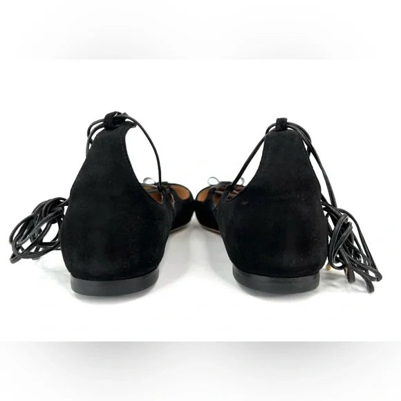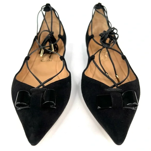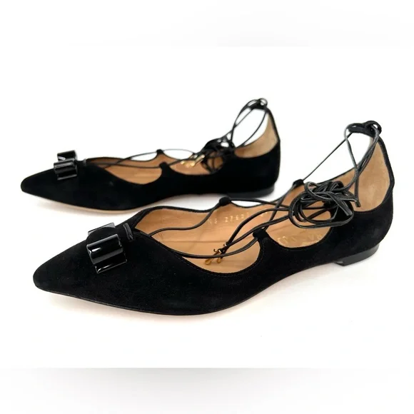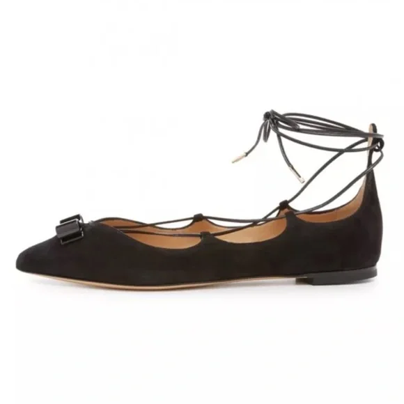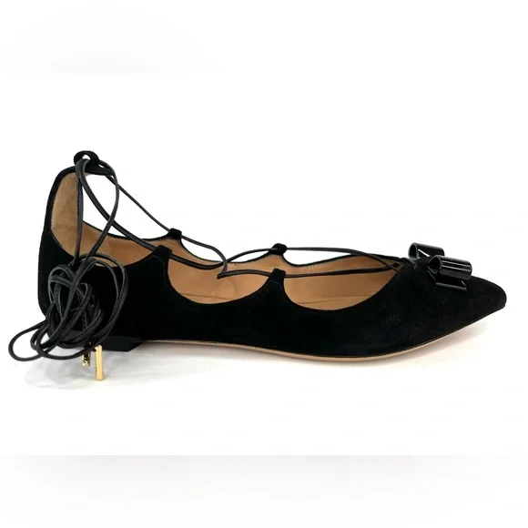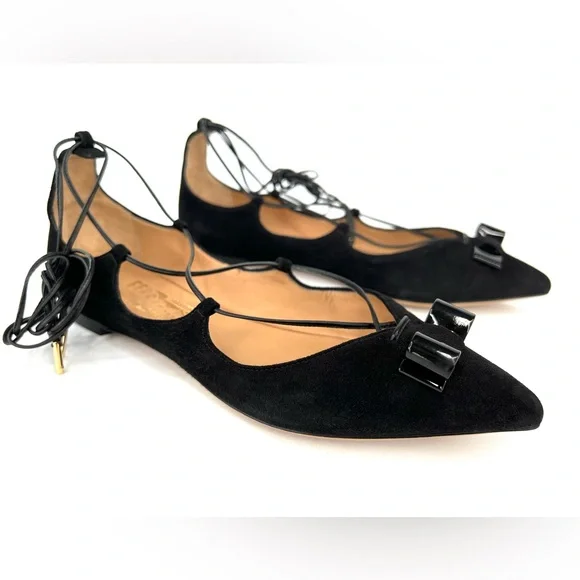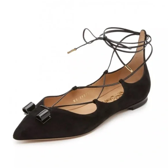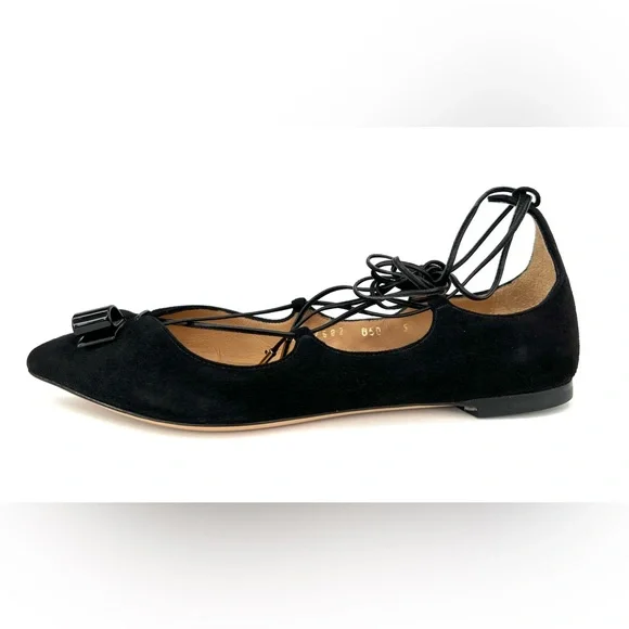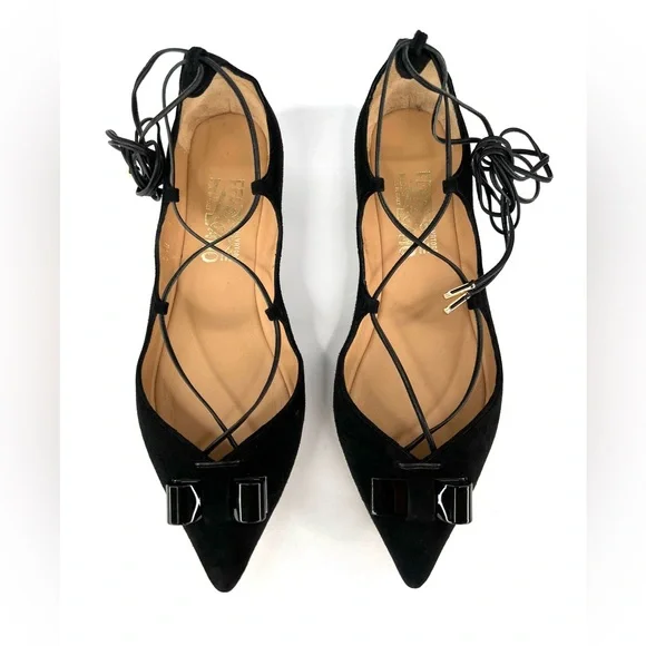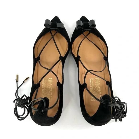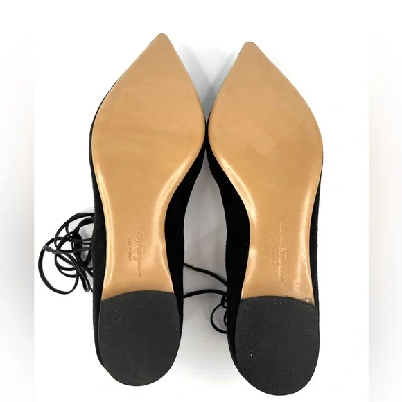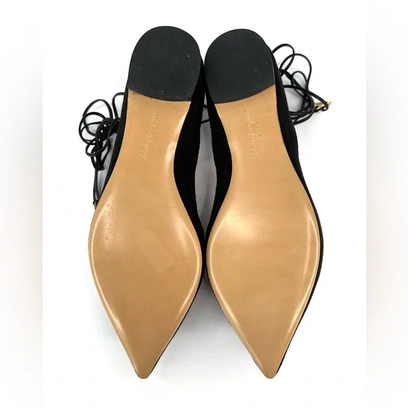 Salvatore Ferragamo Claire Black Suede Ankle Strap Bow Wraparound Flats US 5