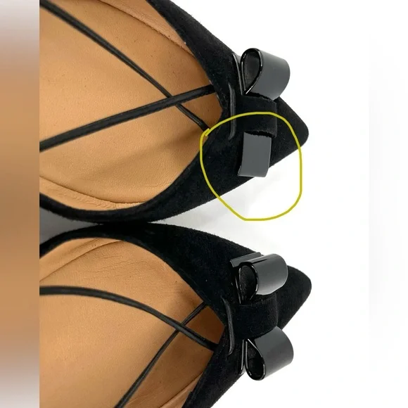 Salvatore Ferragamo-Condition: *****Brand new item with broken hardware (Missing half bow).-Missing hardware does not affect wearability and only noticeable when looking up-close.-All of our items are 100% authentic.-Item does not include box.-Size: US 5 - EU 35 (Width-M)-Color: Black.-Model: Salvatore Ferragamo Claire-Suede leather upper.-Glossy metal bows adorn vamp.-Pointed toe ballet flats.-Wraparound ankle strap closure.-Leather lining; leather sole.-Made in Italy.-Retails for $695.00-Item ships out within 24 hours.