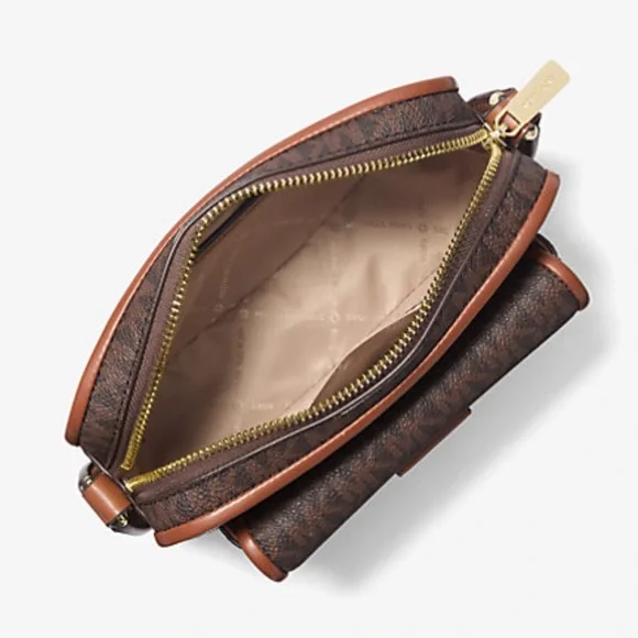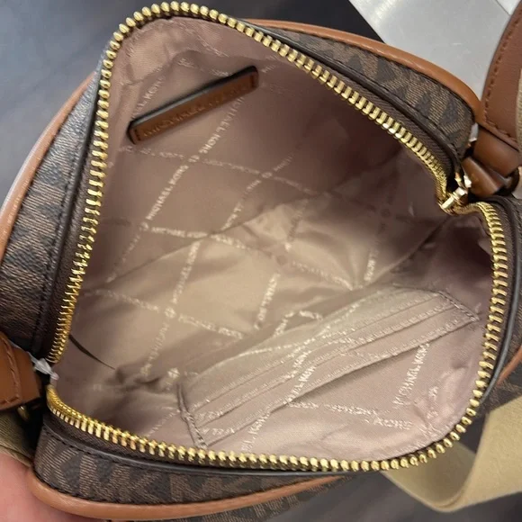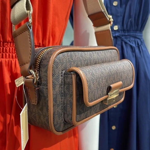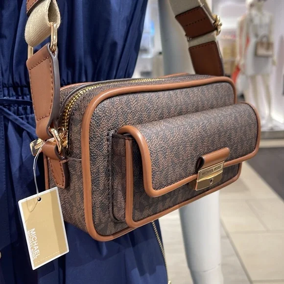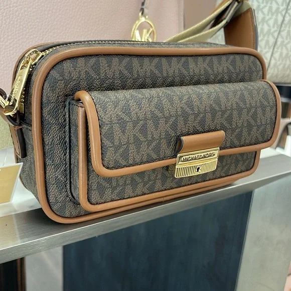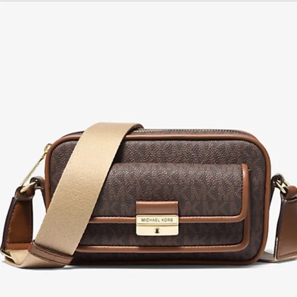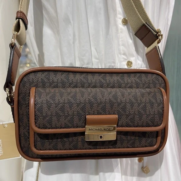 Stylish and versatile, this Michael Kors crossbody bag in brown is perfect for any occasion. Its sleek design and adjustable strap offer both comfort and elegance.Michael Kors Bradshaw Extra-Small Metallic Signature Logo Camera Crossbody Bag Brown NWTAuthentic MK Bradshaw crossbody bag effortlessly combines style with versatility. Designed in a camera-bag-inspired shape, it marries logo-print canvas with smooth accents that adds sophistication to its wear-everywhere appeal.• Crossbody bag• Logo-print canvas• 89.4% coated canvas/9.6% polyester/1% polyurethane• Trim: 100% polyurethane• Gold-tone hardware• 7.5"W X 4.5"H X 2"D• Exterior details: front slip pocket• Interior details: 3 card slots• Lining: 100% polyester• Zip fastening• Dust bag not included• Imported• Style # 35R5G2BC0B