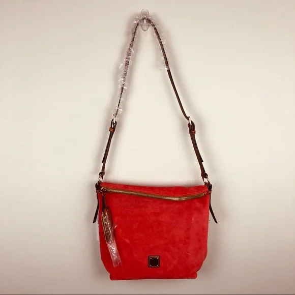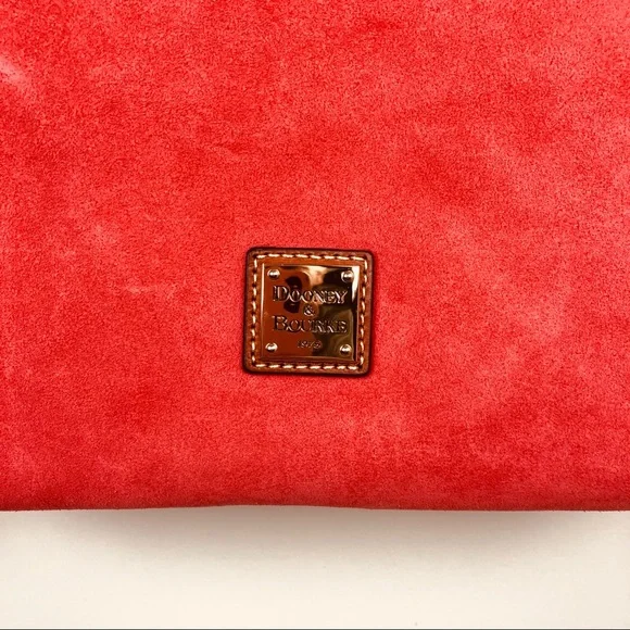 Suede, tomato color.Zip top closure, lined. Tassel pull on zipper.Brand new! Dimensions:13.5”W x 12.5”H x 4.5”DAdjustable strap:38”Condition:NWTNo account? Use code...