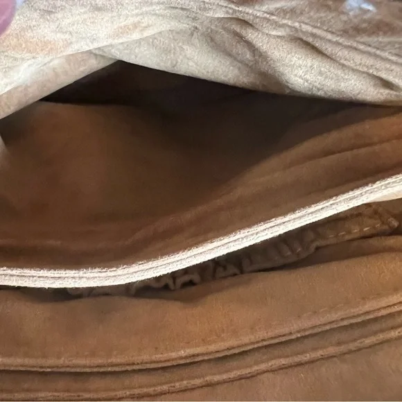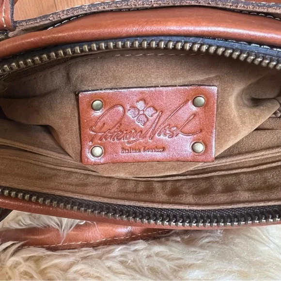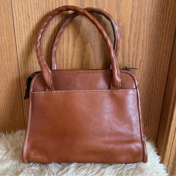 In excellent like new condition brown full grain leather small satchel. Top zip closure. Interior has 1 zip pocket and 2 elastic slip pockets. Exterior has 1 front pocket and 1 back pocket. Bag is lined with faux suede lining. Front has a deep embossed grape leaf logo. There is a removable crossbody strap. Approximate measurements: 9”H x 10”W x 3”D. Handle drop 6”.