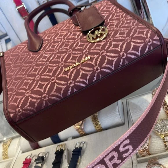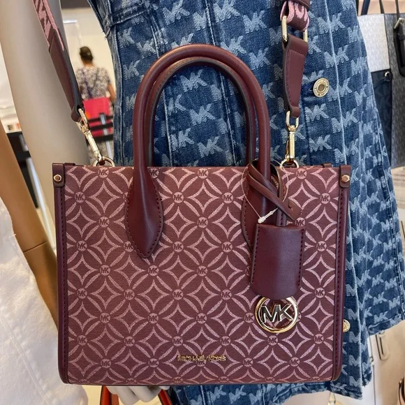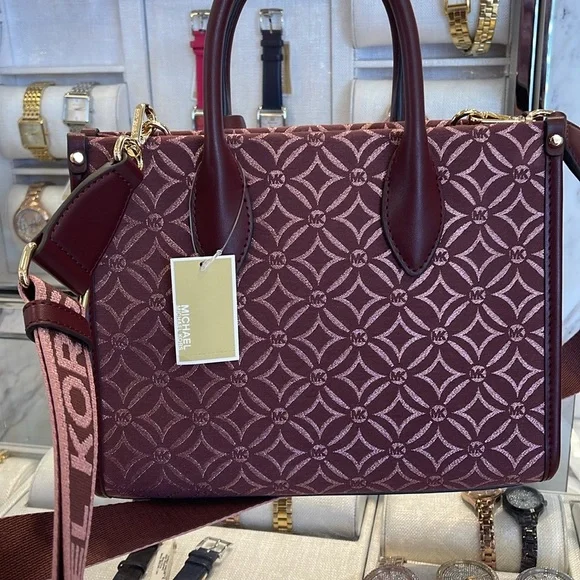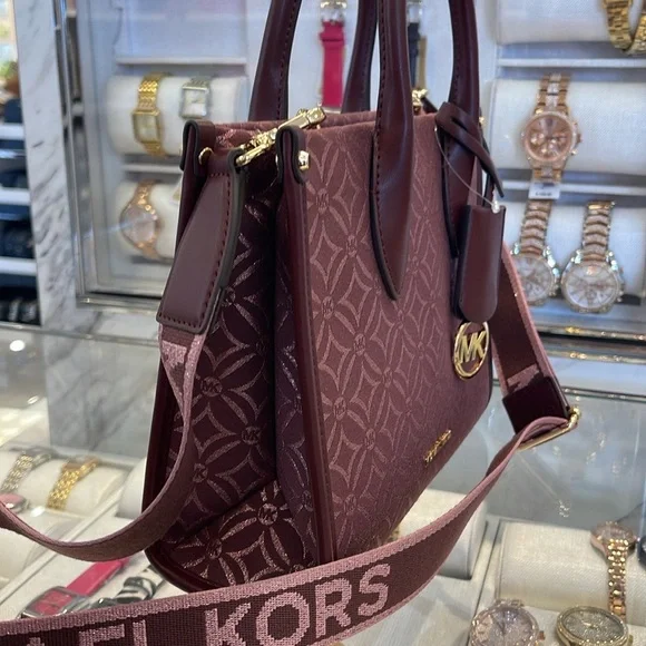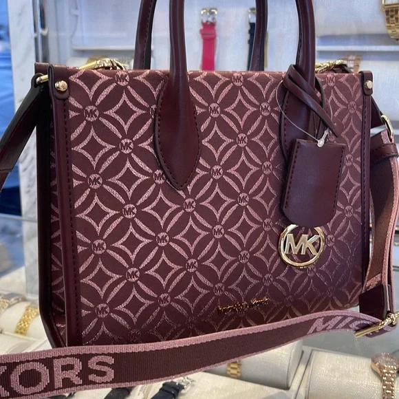 Elevate your style with this elegant Michael Kors bag in a rich burgundy hue. Perfect for any occasion, this bag combines luxury and functionality.Michael Kors Mirella Small Metallic Logo Jacquard Crossbody BagOxblood Multi NWTAuthentic Woven with a kaleidoscopic take on our initials, the Mirella crossbody bag features light-catching metallic threads and a polished MK charm. Its compact size is perfect for days about town. Carry it by the smooth top handles or over the shoulder via the detachable logo-tape strap.• Crossbody bag• Logo jacquard• 63.7% polyester/36.3% cotton• Trim: 60% polyurethane/20% cotton/20% polyester• Gold r-tone hardware• 9.25”W X 7.75”H X 3.75”D• Handle drop: 3.25”• Adjustable strap: 20.25”-23.75”• Interior details: back zip pocket• Lining: 100% polyester• Zip fastening• Dust bag not included• Imported• Style # 35F4G7ZC5J