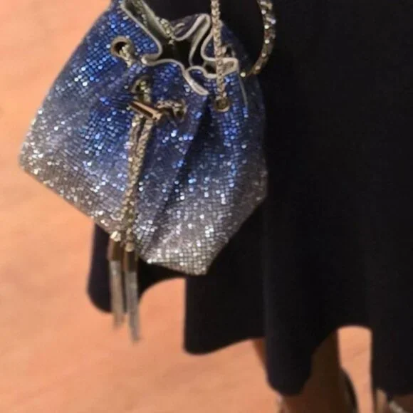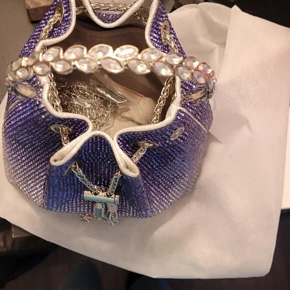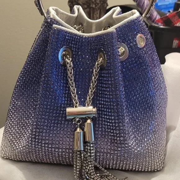 Neiman Marcus Blue Rain Bling Crystal Rhinestone Purse The surface of the bag is made of 10,000 high-quality crystal rhinestones, and the inside is made of soft polyester, a trendy elegant luxury evening bag.6.7" x 4.3" x 5.9" / 17cm x 11cm x 15cm. This fashion shimmering rhinestone purse can hold your daily essentials like cell phone, lipstick, make ups, mini earphones, small wallet, sunglasses, keys etc.Protect your bag with a tassel hook & drawstring and tensioning the chain securely. The length of bling purse can be adjust you want, use it as a crossbody bag or shoulder bag; also use metal diamond handle as a clutch purse, handbag.This sparkly crossbody shoulder bag is perfect for social activites like evening, party, wedding, prom, festival events or just evening out. It will works very well with your outfit and jewelry, making you look a shining star in activity.Shipped out today!