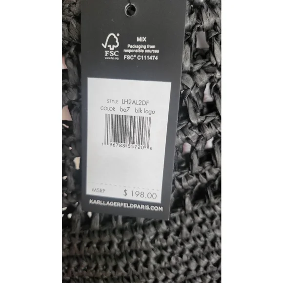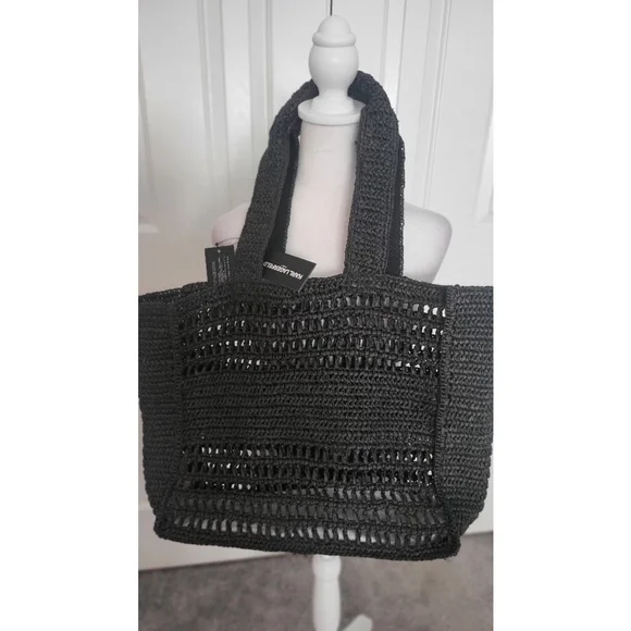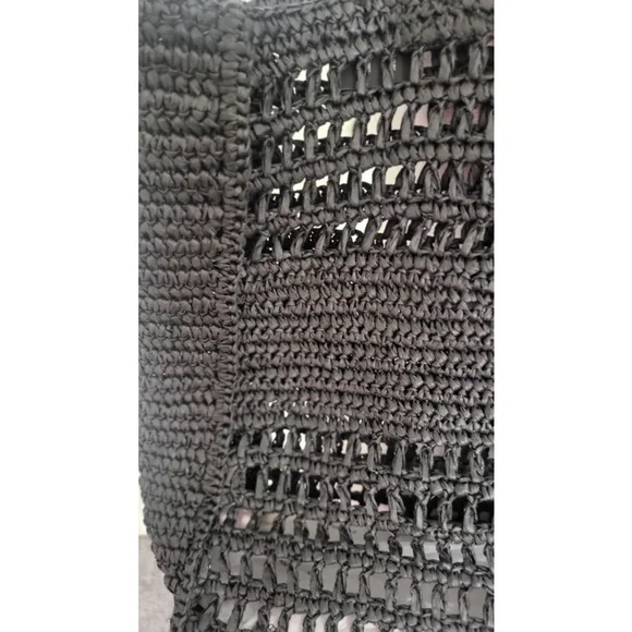 This is a new with tags Karl Lagerfeld black crochet tote bag. The bag is made of a woven straw-like material and features a large, open design with a white "KARL LAGERFELD PARIS" logo on the front. The bag has two black woven handles and a black lining. The bag measures approximately 14 inches wide, 14 inches tall, and 6 inches deep. The bag is in excellent condition and comes with its original tags. The bag is perfect for the beach, everyday use or for a special occasion.