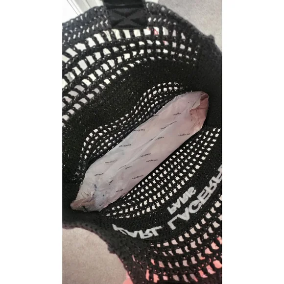 This is a new with tags Karl Lagerfeld black crochet tote bag. The bag is made of a woven straw-like material and features a large, open design with a white "KARL LAGERFELD PARIS"...