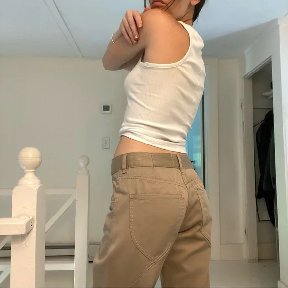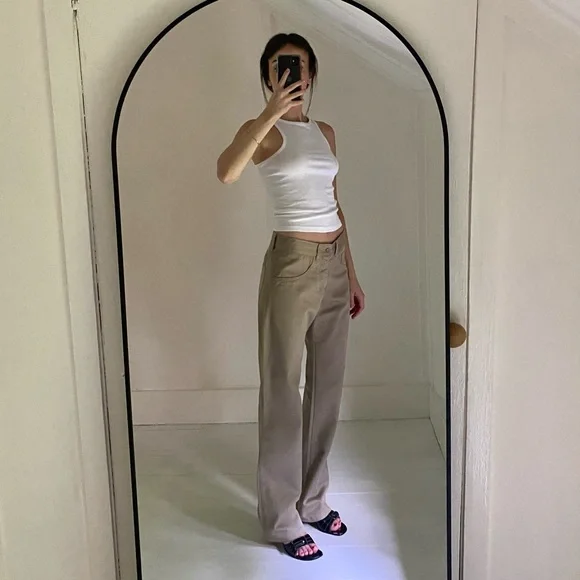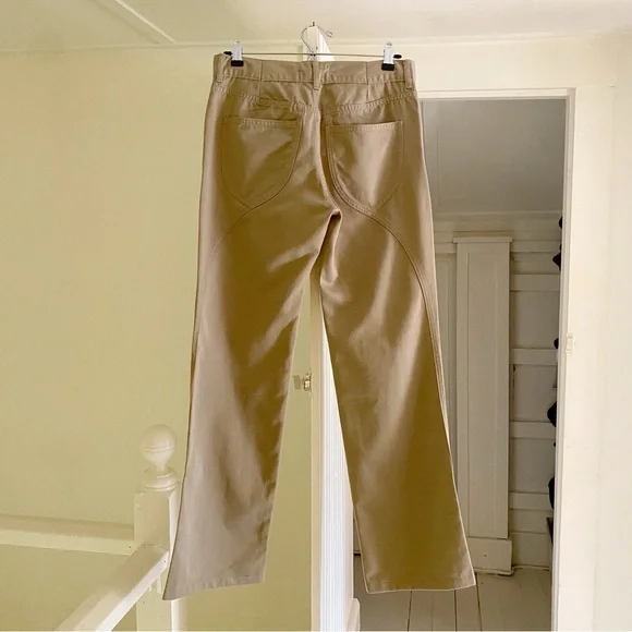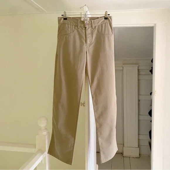 Zucca Travail beige, solid, midrise, straight leg khaki pants. Non-stretch cotton twill fabric construction with seamed detailing at back. Relaxed fit, midwaisted, full length, straight leg silhouette. Front coin pocket, decorative pockets & back patch pockets. Concealed button fly closure. Made in France. Size 1 / S. Excellent condition - tailored waist.Quality: 100% cottonWaist: 29.5”Rise: 10”Inseam: 31”---H5136